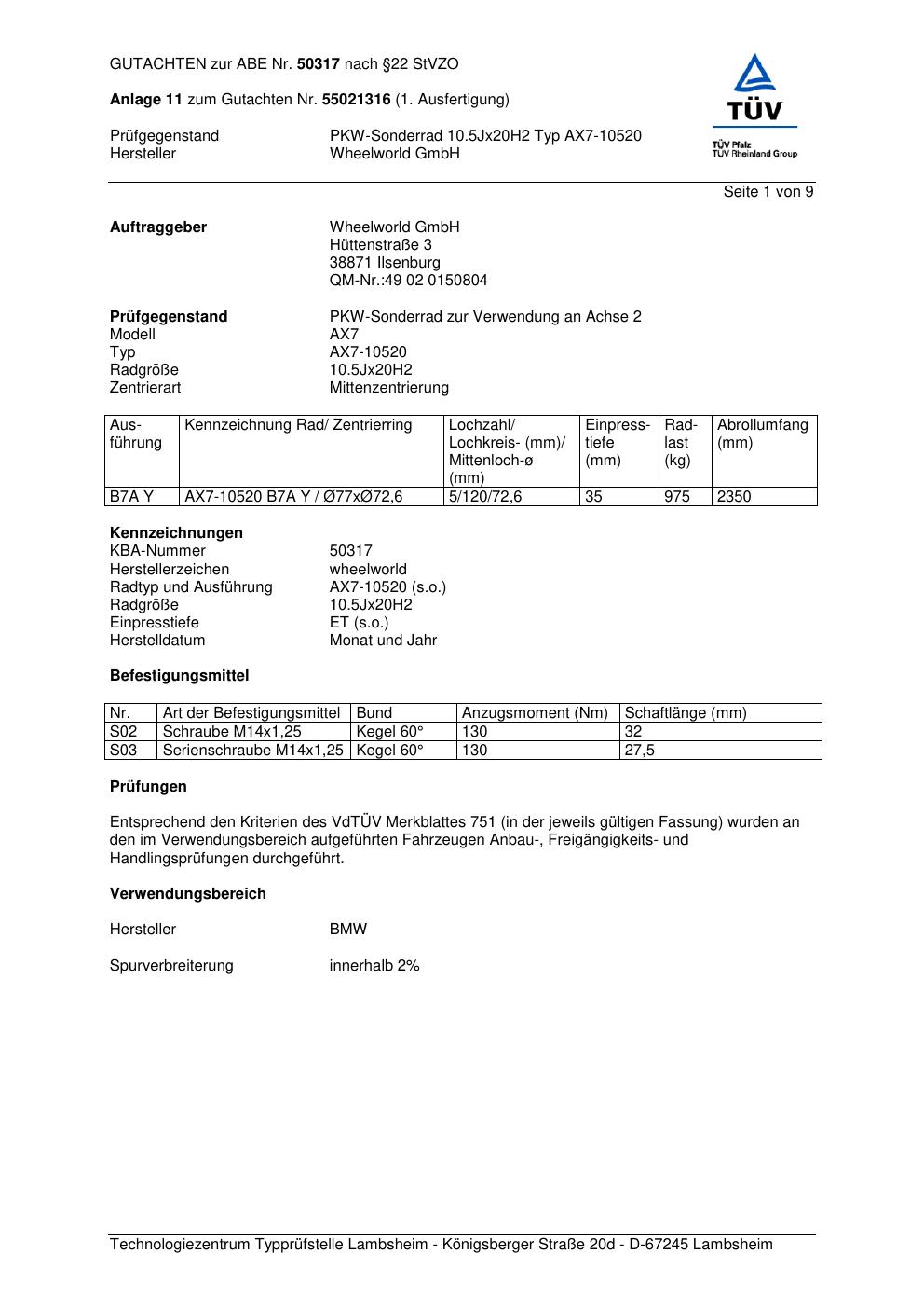Dieses abe der Marke Wheelworld stammt vom jeweiligen Hersteller, Importeur oder einer Prüforganisation. Felgengutachten.de beansprucht hieran keine eigenen Urheber-, Nutzungs- oder sonstigen Schutzrechte. Soweit das Dokument urheber- oder leistungsschutzrechtlich geschützt ist, verbleiben die Rechte beim jeweiligen Rechteinhaber. Die Bereitstellung erfolgt ausschließlich zu Informationszwecken für Endnutzer, z. B. zur Vorlage bei Prüfstellen oder zur eigenen Fahrzeugdokumentation.