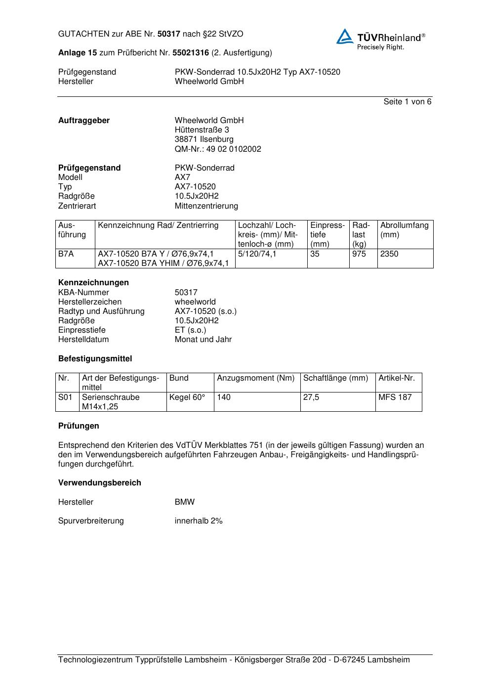 Dieses abe der Marke Wheelworld stammt vom jeweiligen Hersteller, Importeur oder einer Prüforganisation. Felgengutachten.de beansprucht hieran keine eigenen Urheber-, Nutzungs- oder sonstigen Schutzrechte. Soweit das Dokument urheber- oder leistungsschutzrechtlich geschützt ist, verbleiben die Rechte beim jeweiligen Rechteinhaber. Die Bereitstellung erfolgt ausschließlich zu Informationszwecken für Endnutzer, z. B. zur Vorlage bei Prüfstellen oder zur eigenen Fahrzeugdokumentation.