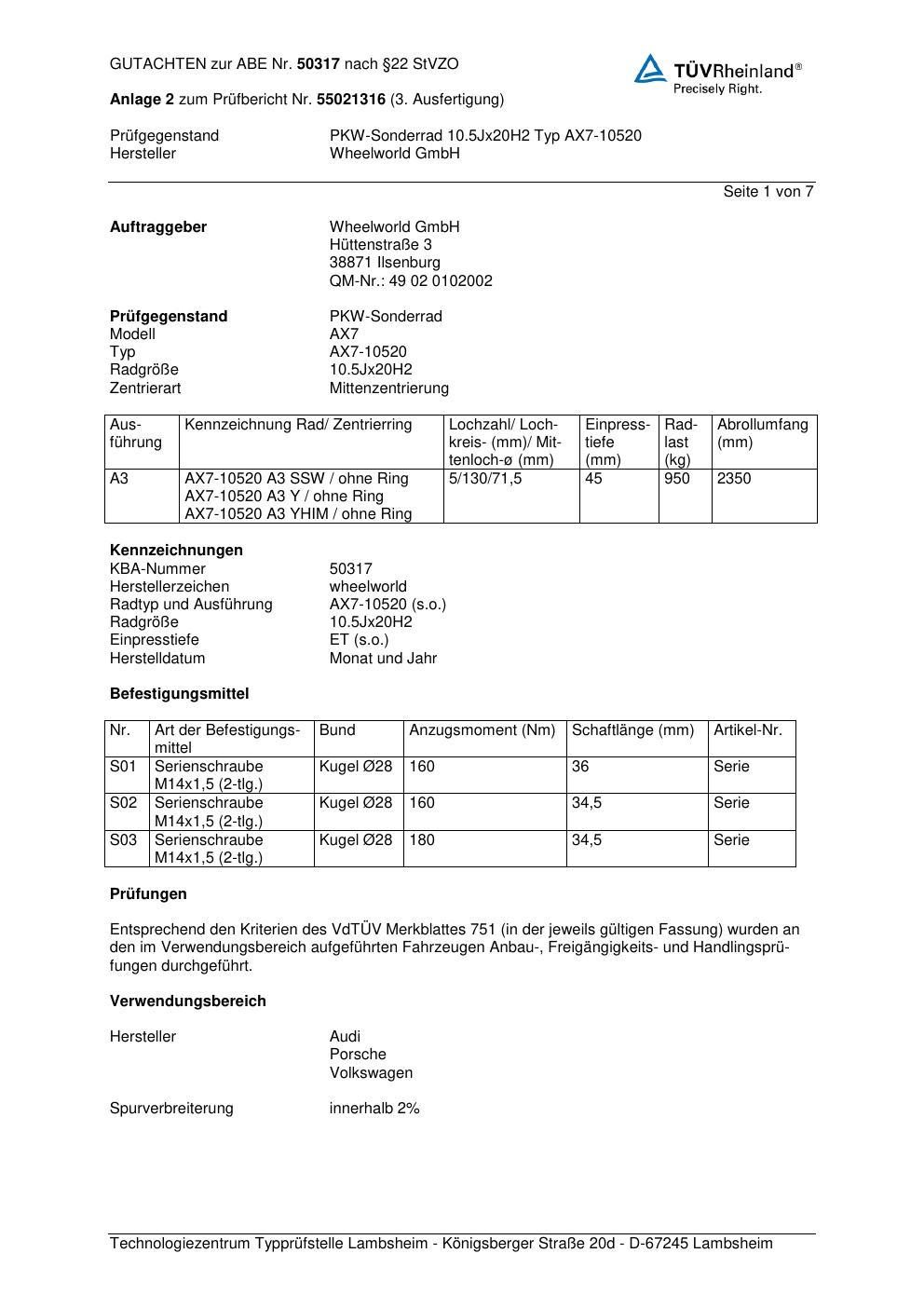 Dieses abe der Marke Wheelworld stammt vom jeweiligen Hersteller, Importeur oder einer Prüforganisation. Felgengutachten.de beansprucht hieran keine eigenen Urheber-, Nutzungs- oder sonstigen Schutzrechte. Soweit das Dokument urheber- oder leistungsschutzrechtlich geschützt ist, verbleiben die Rechte beim jeweiligen Rechteinhaber. Die Bereitstellung erfolgt ausschließlich zu Informationszwecken für Endnutzer, z. B. zur Vorlage bei Prüfstellen oder zur eigenen Fahrzeugdokumentation.