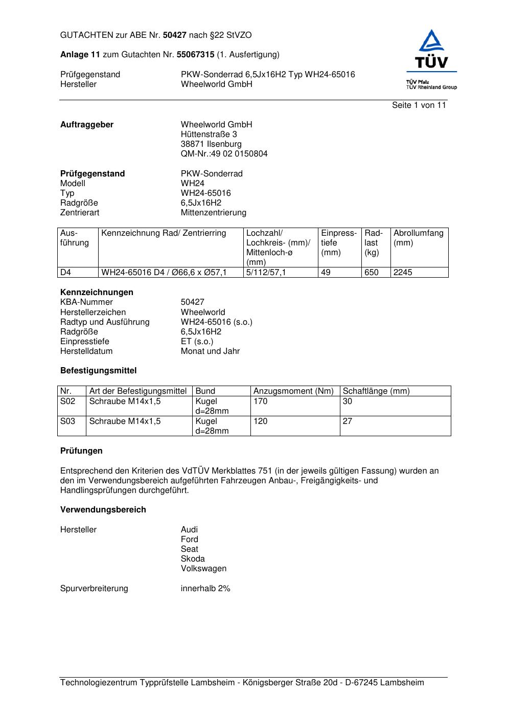 Dieses Gutachten (abe) bezieht sich auf die Alufelge Wheelworld GmbH WH24-65016 in der Ausführung ET 0, Mittenloch 0 mm (KBA 50427). Im PDF findest du typischerweise zulässige Reifengrößen, Auflagen/Anbauhinweise und – je nach Dokument – Hinweise zur Eintragung.