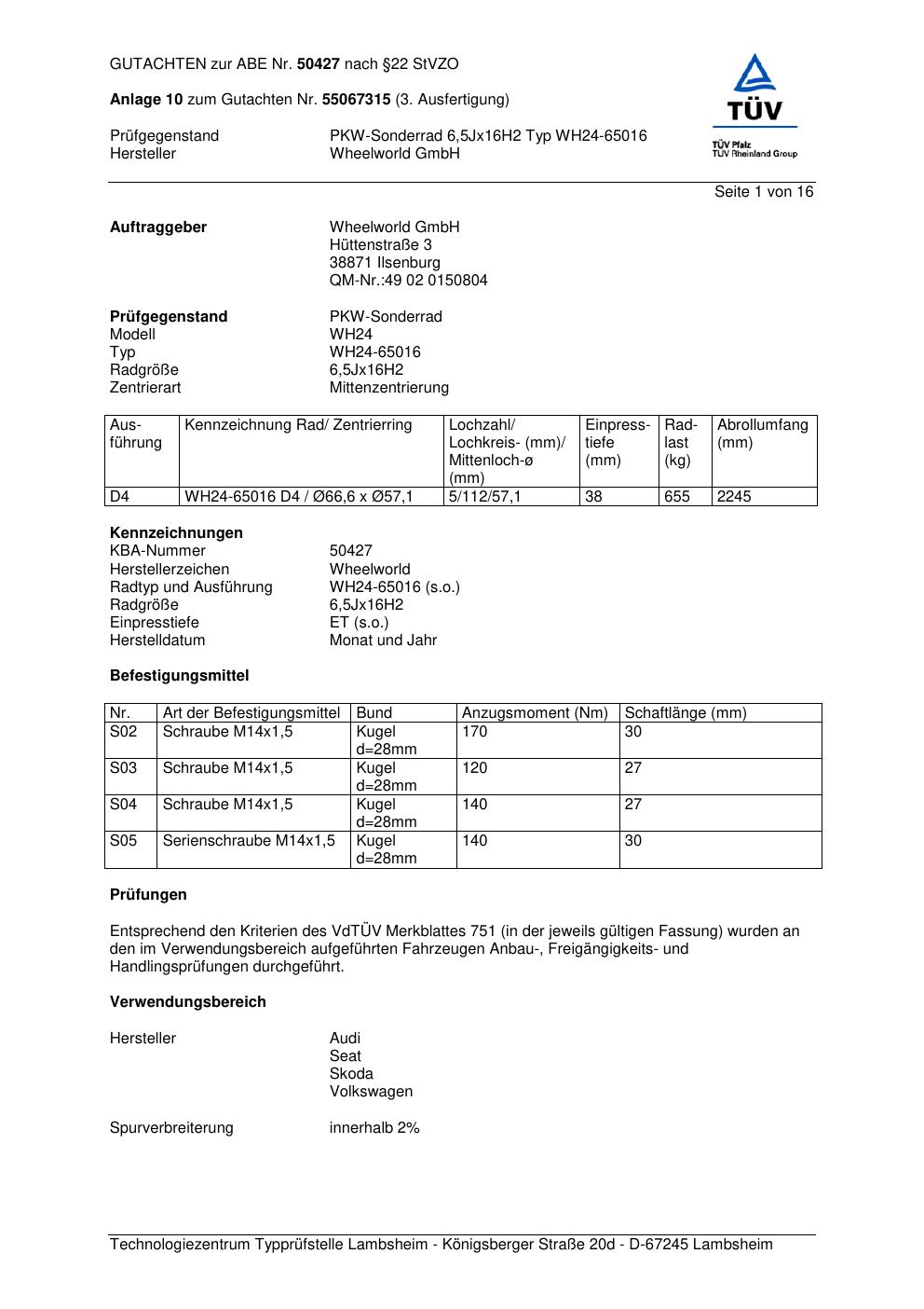 Felgengutachten / abe für Alufelgen Wheelworld GmbH WH24-65016 (ET 0, Mittenloch 0 mm) mit KBA 50427 (Zertifikatsnummer 50427). Hier kostenlos als PDF herunterladen. Der Download-Link ist 24 Stunden gültig und kann bis zu zwei Mal verwendet werden.