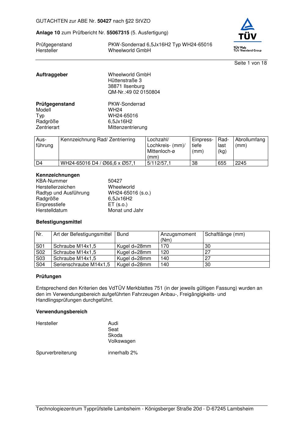 Felgengutachten / abe für Alufelgen Wheelworld GmbH WH24-650 16 (ET 0, Mittenloch 0 mm) mit KBA 50427 (Zertifikatsnummer 50427). Hier kostenlos als PDF herunterladen. Der Download-Link ist 24 Stunden gültig und kann bis zu zwei Mal verwendet werden.