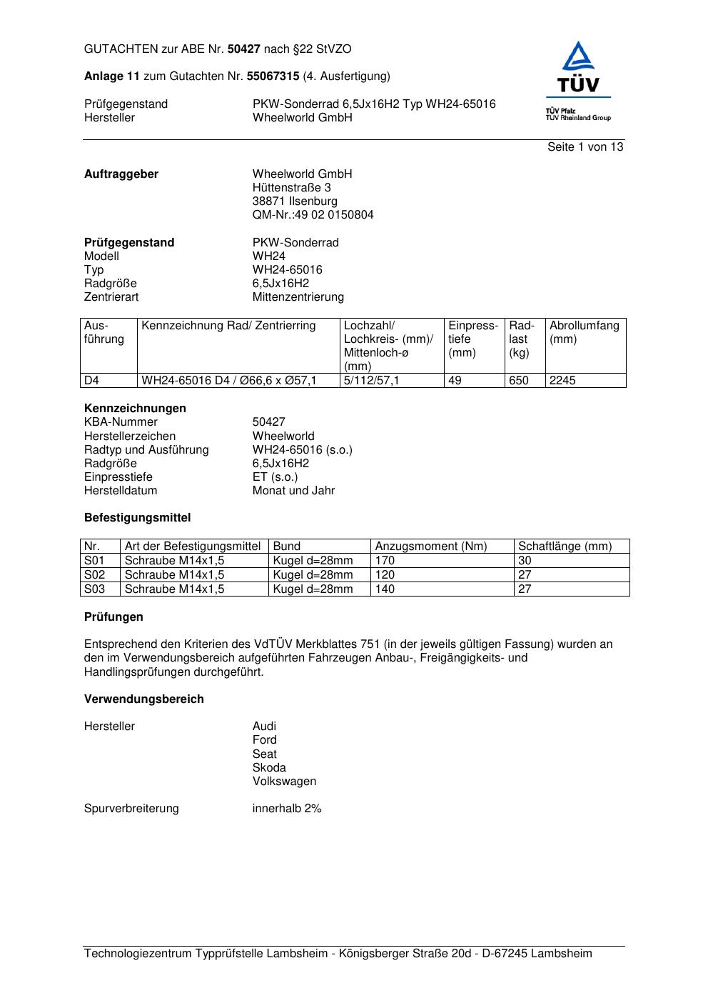 Dieses Gutachten (abe) bezieht sich auf die Alufelge Wheelworld GmbH WH24-65016 in der Ausführung ET 0, Mittenloch 0 mm (KBA 50427). Im PDF findest du typischerweise zulässige Reifengrößen, Auflagen/Anbauhinweise und – je nach Dokument – Hinweise zur Eintragung.