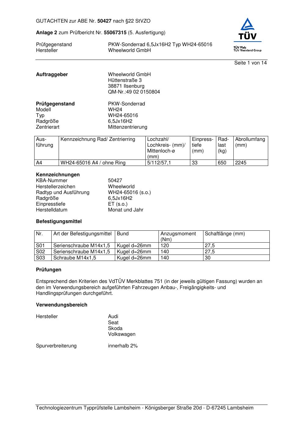 Dieses Gutachten (abe) bezieht sich auf die Alufelge Wheelworld GmbH WH24-65016 in der Ausführung ET 0, Mittenloch 0 mm (KBA 50427). Im PDF findest du typischerweise zulässige Reifengrößen, Auflagen/Anbauhinweise und – je nach Dokument – Hinweise zur Eintragung.