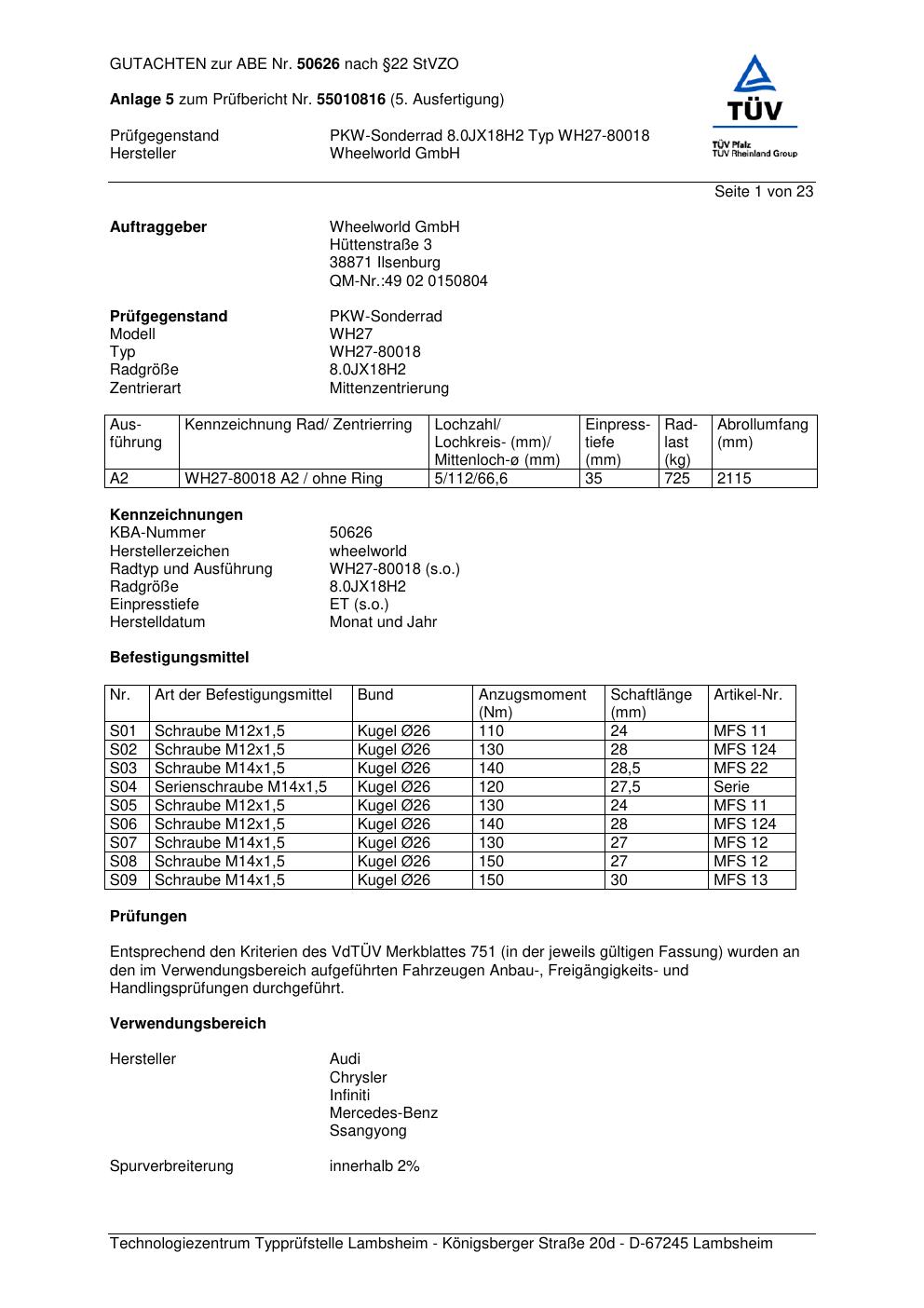 Dieses abe der Marke Wheelworld stammt vom jeweiligen Hersteller, Importeur oder einer Prüforganisation. Felgengutachten.de beansprucht hieran keine eigenen Urheber-, Nutzungs- oder sonstigen Schutzrechte. Soweit das Dokument urheber- oder leistungsschutzrechtlich geschützt ist, verbleiben die Rechte beim jeweiligen Rechteinhaber. Die Bereitstellung erfolgt ausschließlich zu Informationszwecken für Endnutzer, z. B. zur Vorlage bei Prüfstellen oder zur eigenen Fahrzeugdokumentation.