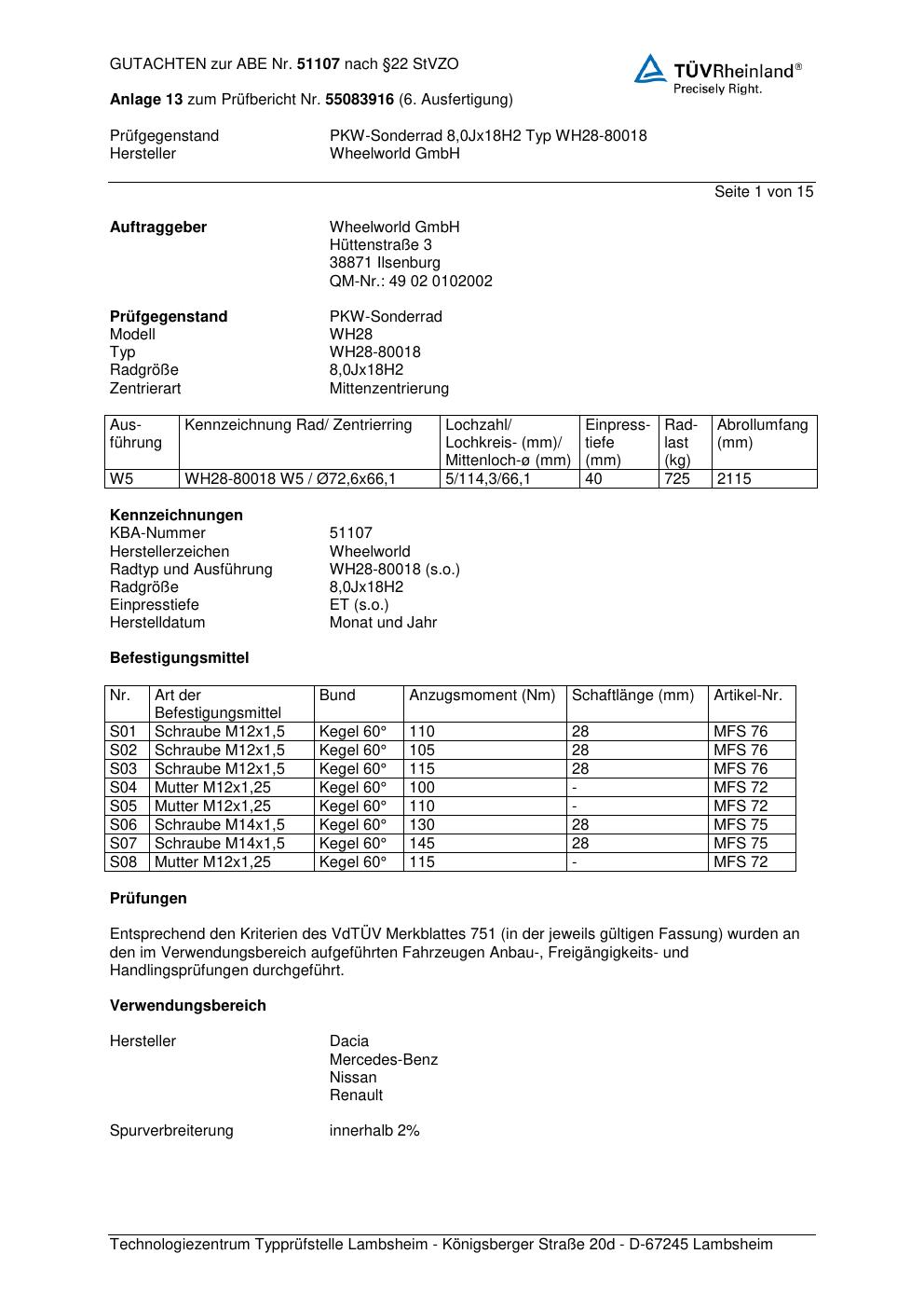 • Stimmt die KBA-Nummer auf der Felge mit diesem Dokument überein?