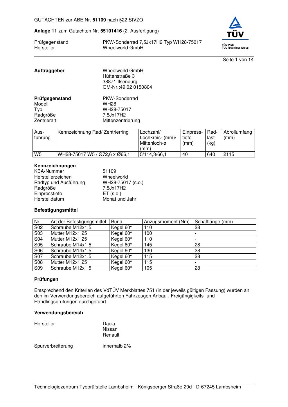 Dieses Gutachten (abe) bezieht sich auf die Alufelge Wheelworld WH28-75017 in der Ausführung ET 0, Mittenloch 0 mm (KBA 51109). Im PDF findest du typischerweise zulässige Reifengrößen, Auflagen/Anbauhinweise und – je nach Dokument – Hinweise zur Eintragung.