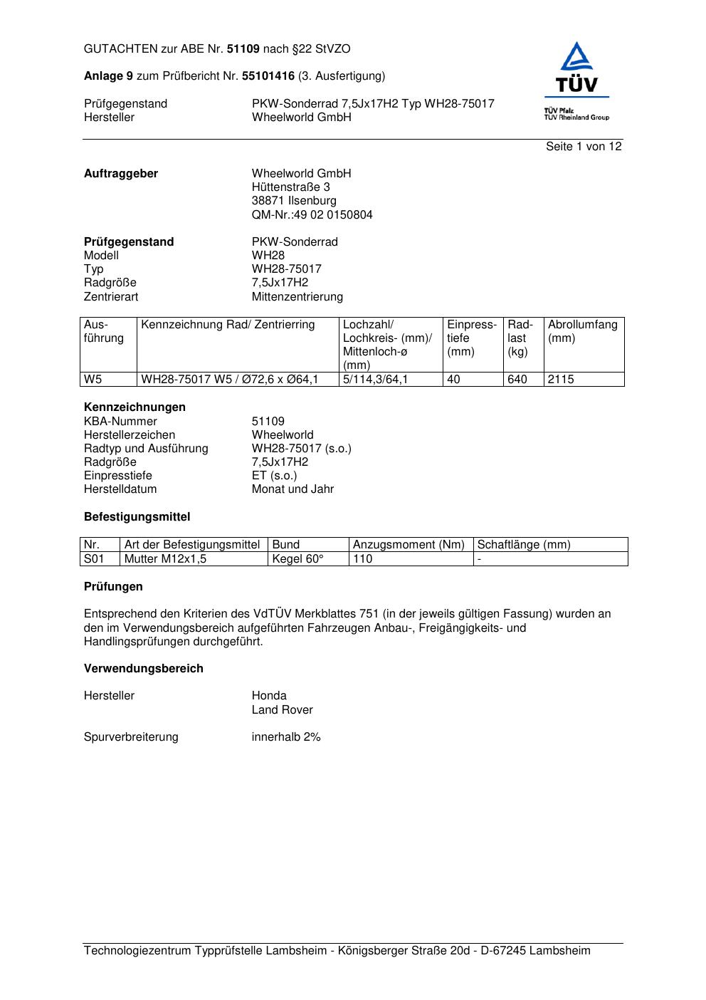 Dieses Gutachten (abe) bezieht sich auf die Alufelge Wheelworld WH28-750 17 in der Ausführung ET 0, Mittenloch 0 mm (KBA 51109). Im PDF findest du typischerweise zulässige Reifengrößen, Auflagen/Anbauhinweise und – je nach Dokument – Hinweise zur Eintragung.