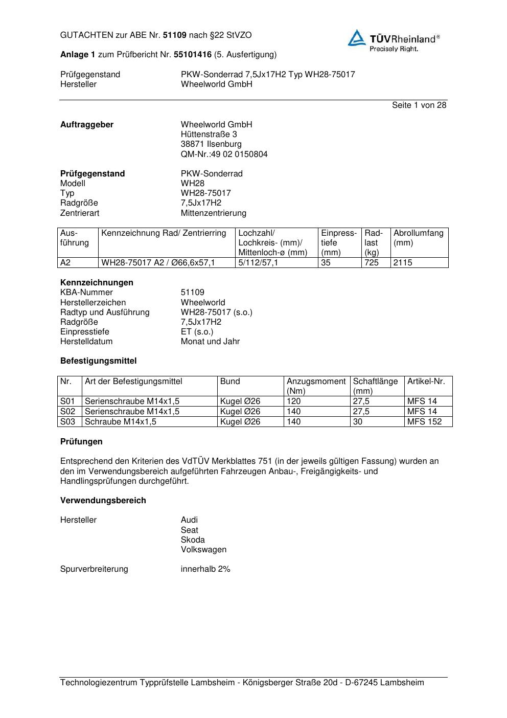 Dieses Gutachten (abe) bezieht sich auf die Alufelge Wheelworld WH28-750 17 in der Ausführung ET 0, Mittenloch 0 mm (KBA 51109). Im PDF findest du typischerweise zulässige Reifengrößen, Auflagen/Anbauhinweise und – je nach Dokument – Hinweise zur Eintragung.