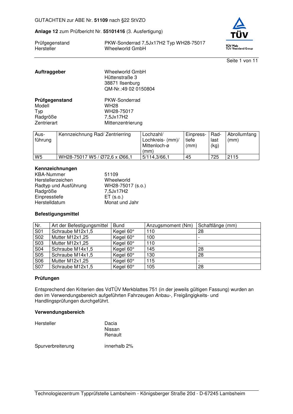 Dieses Gutachten (abe) bezieht sich auf die Alufelge Wheelworld WH28-75017 in der Ausführung ET 0, Mittenloch 0 mm (KBA 51109). Im PDF findest du typischerweise zulässige Reifengrößen, Auflagen/Anbauhinweise und – je nach Dokument – Hinweise zur Eintragung.