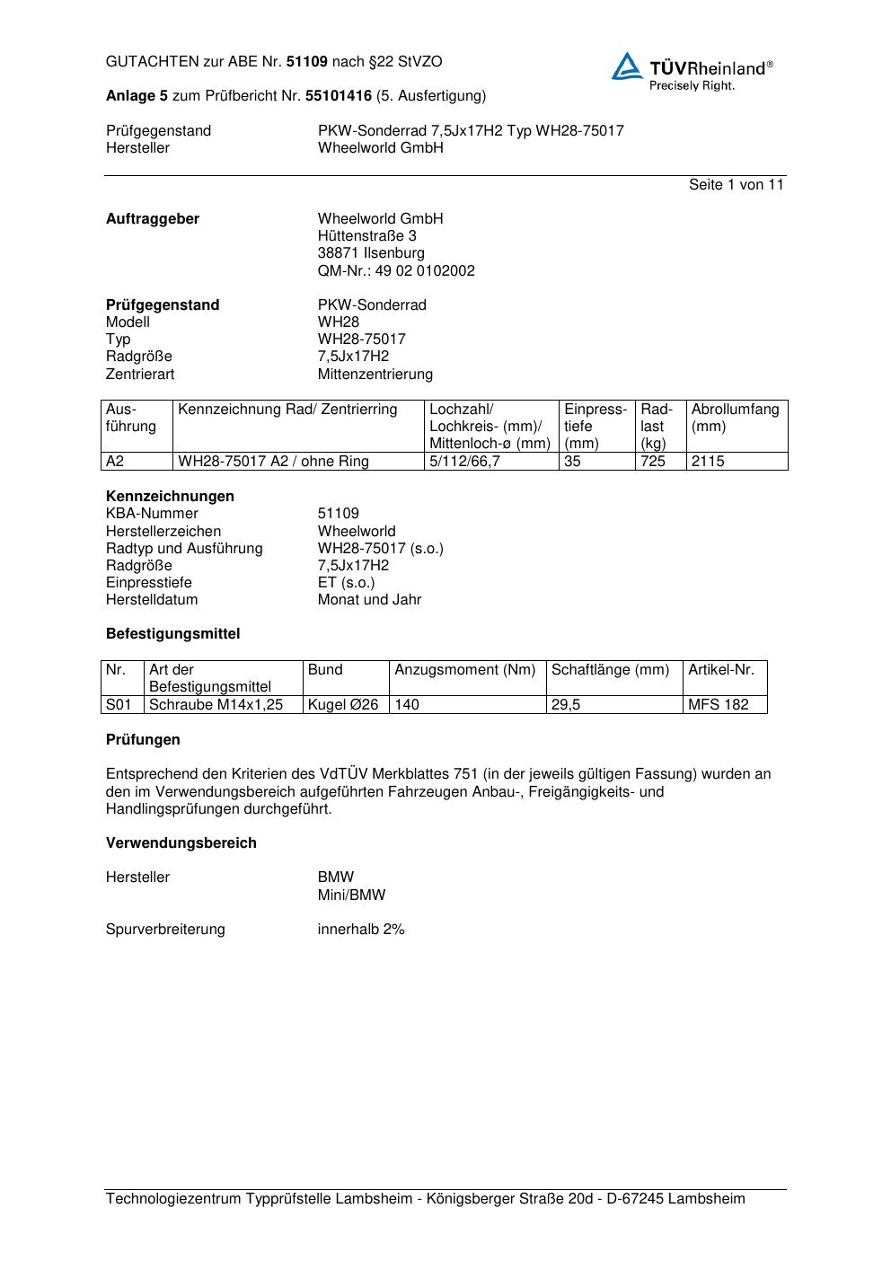 Dieses Gutachten (abe) bezieht sich auf die Alufelge Wheelworld WH28-75017 in der Ausführung ET 0, Mittenloch 0 mm (KBA 51109). Im PDF findest du typischerweise zulässige Reifengrößen, Auflagen/Anbauhinweise und – je nach Dokument – Hinweise zur Eintragung.