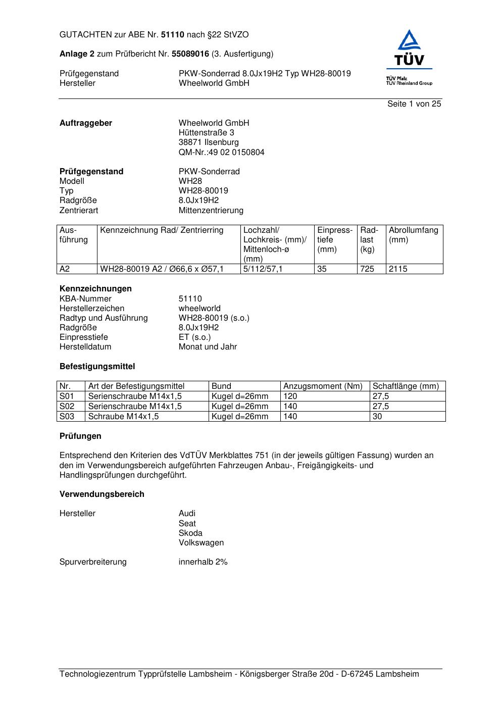 Dieses Gutachten (abe) bezieht sich auf die Alufelge Wheelworld WH28-80019 in der Ausführung ET 0, Mittenloch 0 mm (KBA 51110). Im PDF findest du typischerweise zulässige Reifengrößen, Auflagen/Anbauhinweise und – je nach Dokument – Hinweise zur Eintragung.
