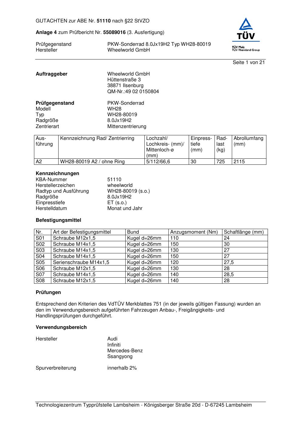 Felgengutachten / abe für Alufelgen Wheelworld WH28-80019 (ET 0, Mittenloch 0 mm) mit KBA 51110 (Zertifikatsnummer 51110). Hier kostenlos als PDF herunterladen. Der Download-Link ist 24 Stunden gültig und kann bis zu zwei Mal verwendet werden.
