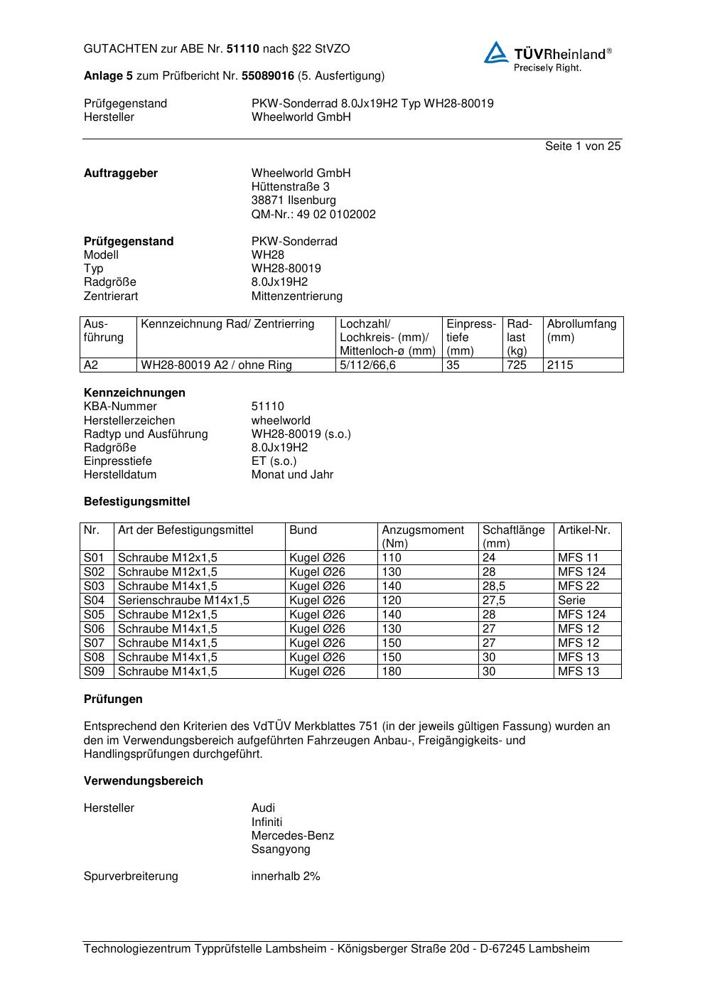Dieses Gutachten (abe) bezieht sich auf die Alufelge Wheelworld WH28-80019 in der Ausführung ET 0, Mittenloch 0 mm (KBA 51110). Im PDF findest du typischerweise zulässige Reifengrößen, Auflagen/Anbauhinweise und – je nach Dokument – Hinweise zur Eintragung.
