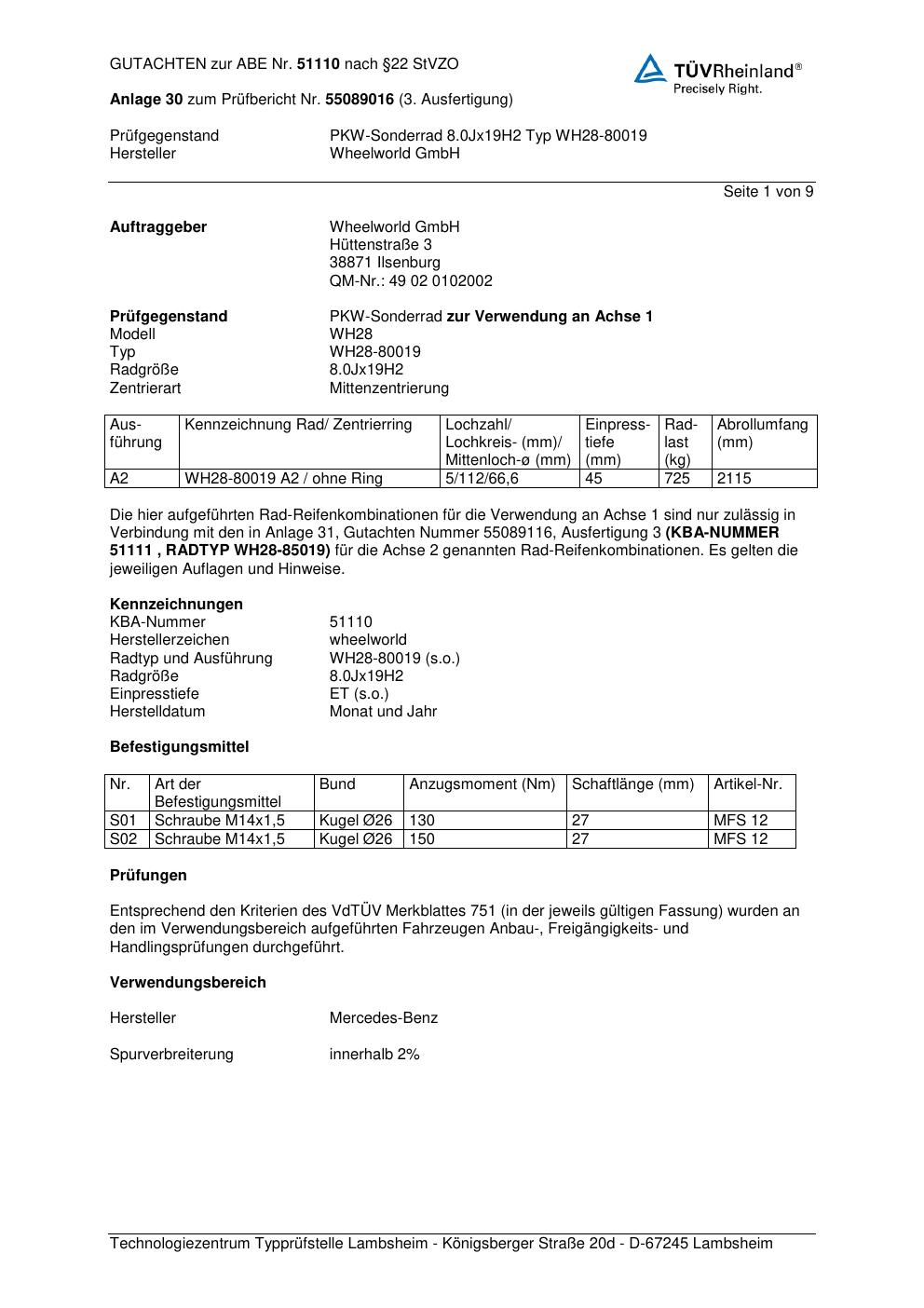 Dieses Gutachten (abe) bezieht sich auf die Alufelge Wheelworld GmbH WH28-80019 in der Ausführung ET 0, Mittenloch 0 mm (KBA 51110). Im PDF findest du typischerweise zulässige Reifengrößen, Auflagen/Anbauhinweise und – je nach Dokument – Hinweise zur Eintragung.