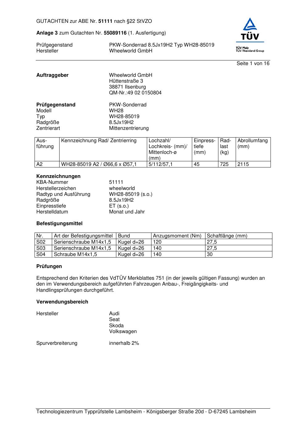 • Prüfe, ob Marke und Serie (Wheelworld WH28-850 19) wirklich zur gesuchten Felge passen.