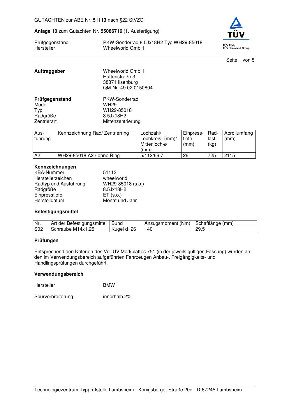 Dieses Gutachten (abe) bezieht sich auf die Alufelge Wheelworld GmbH WH29-85018 in der Ausführung ET 0, Mittenloch 0 mm (KBA 51113). Im PDF findest du typischerweise zulässige Reifengrößen, Auflagen/Anbauhinweise und – je nach Dokument – Hinweise zur Eintragung.