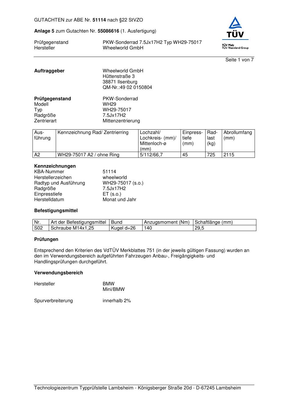 Dieses Gutachten (abe) bezieht sich auf die Alufelge Wheelworld GmbH WH29-750 17 in der Ausführung ET 0, Mittenloch 0 mm (KBA 51114). Im PDF findest du typischerweise zulässige Reifengrößen, Auflagen/Anbauhinweise und – je nach Dokument – Hinweise zur Eintragung.