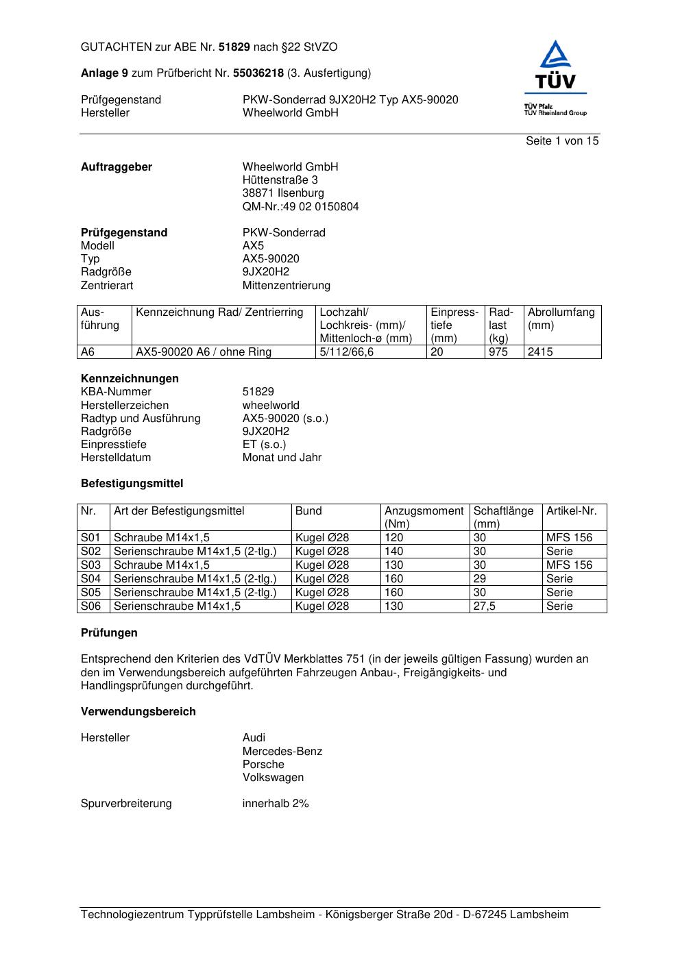 • Stimmt die KBA-Nummer auf der Felge mit diesem Dokument überein?