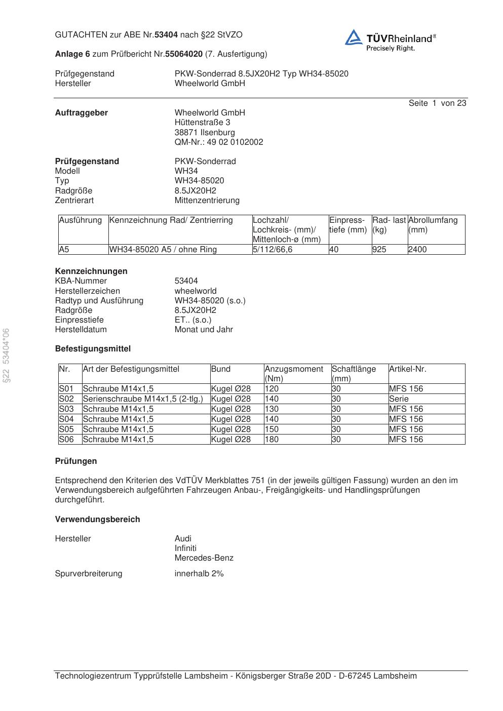 Felgengutachten / abe für Alufelgen Wheelworld GmbH WH34-85020 (ET 0, Mittenloch 0 mm) mit KBA 53404 (Zertifikatsnummer 53404). Hier kostenlos als PDF herunterladen. Der Download-Link ist 24 Stunden gültig und kann bis zu zwei Mal verwendet werden.