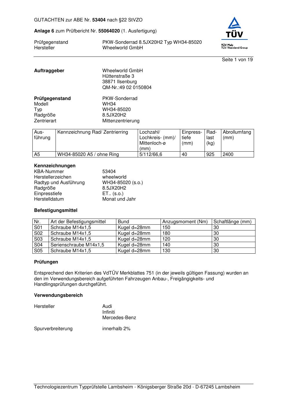 Dieses Gutachten (abe) bezieht sich auf die Alufelge Wheelworld GmbH WH34-85020 in der Ausführung ET 0, Mittenloch 0 mm (KBA 53404). Im PDF findest du typischerweise zulässige Reifengrößen, Auflagen/Anbauhinweise und – je nach Dokument – Hinweise zur Eintragung.