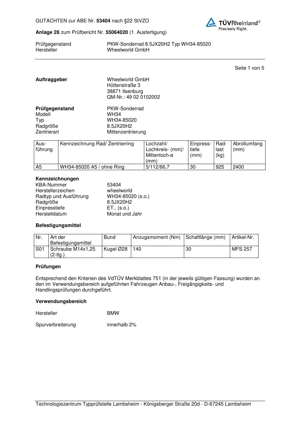 Dieses Gutachten (abe) bezieht sich auf die Alufelge Wheelworld GmbH WH34-850 20 in der Ausführung ET 0, Mittenloch 0 mm (KBA 53404). Im PDF findest du typischerweise zulässige Reifengrößen, Auflagen/Anbauhinweise und – je nach Dokument – Hinweise zur Eintragung.