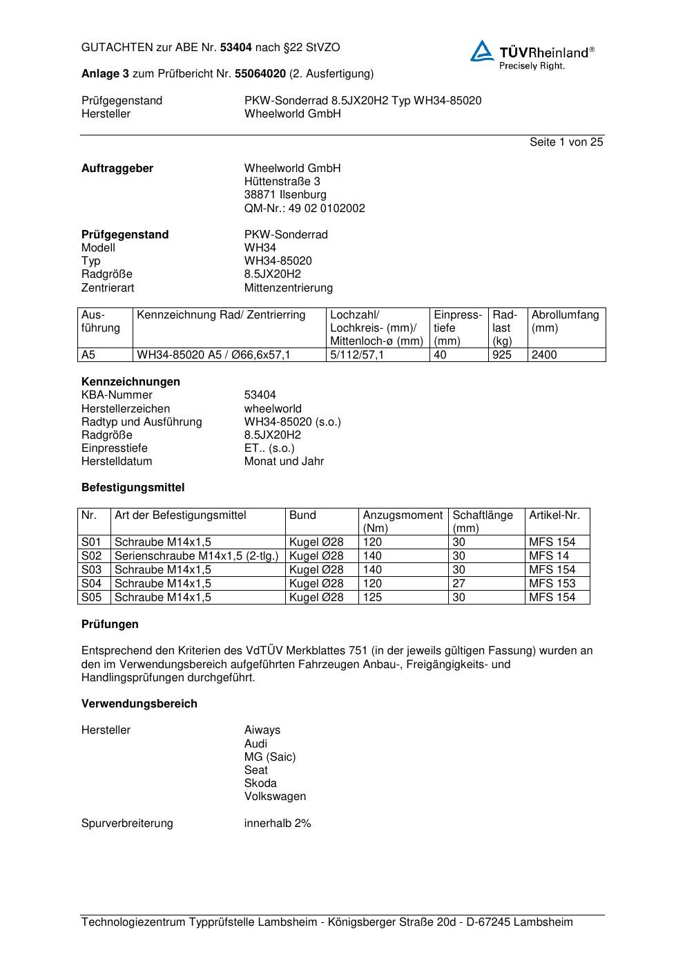Dieses Gutachten (abe) bezieht sich auf die Alufelge Wheelworld GmbH WH34-85020 in der Ausführung ET 0, Mittenloch 0 mm (KBA 53404). Im PDF findest du typischerweise zulässige Reifengrößen, Auflagen/Anbauhinweise und – je nach Dokument – Hinweise zur Eintragung.