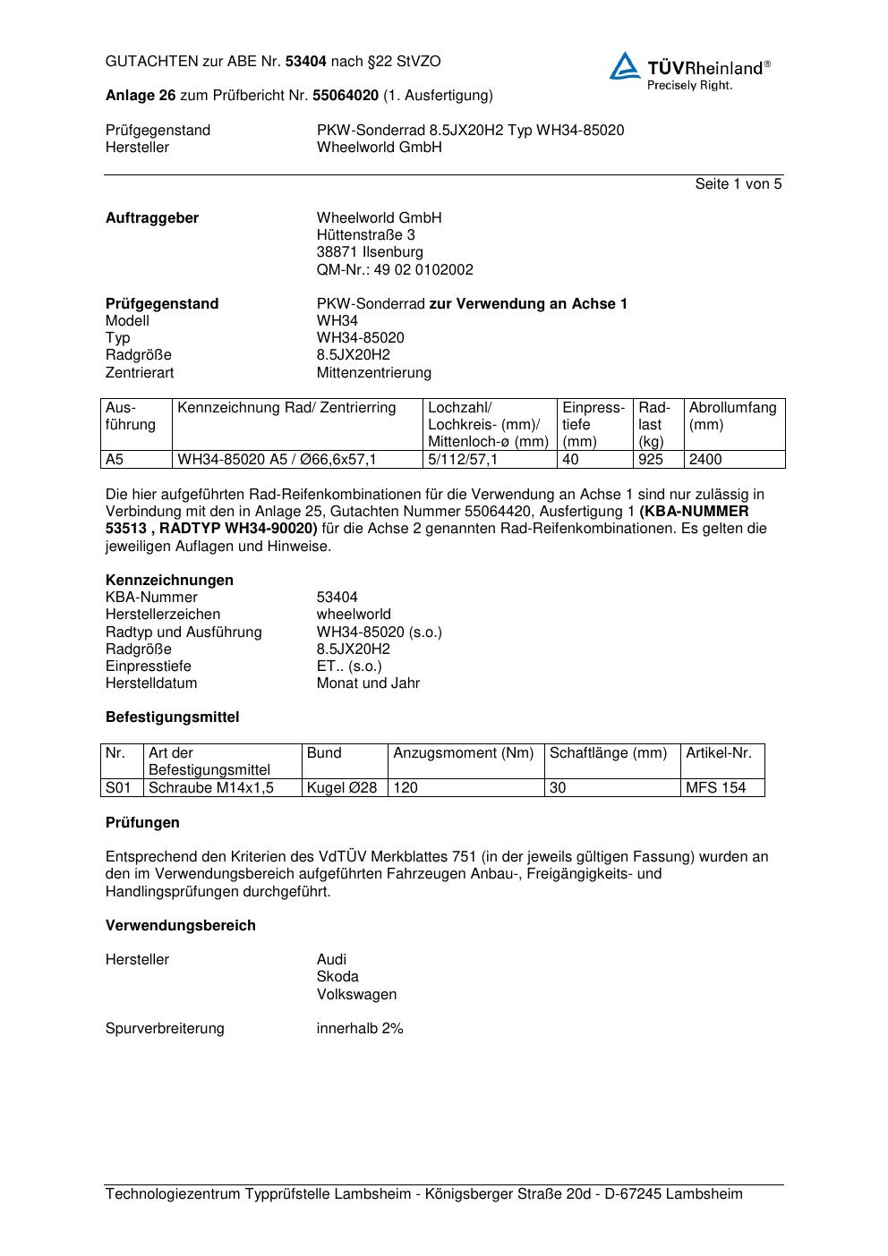 Dieses Gutachten (abe) bezieht sich auf die Alufelge Wheelworld GmbH WH34-85020 in der Ausführung ET 0, Mittenloch 0 mm (KBA 53404). Im PDF findest du typischerweise zulässige Reifengrößen, Auflagen/Anbauhinweise und – je nach Dokument – Hinweise zur Eintragung.