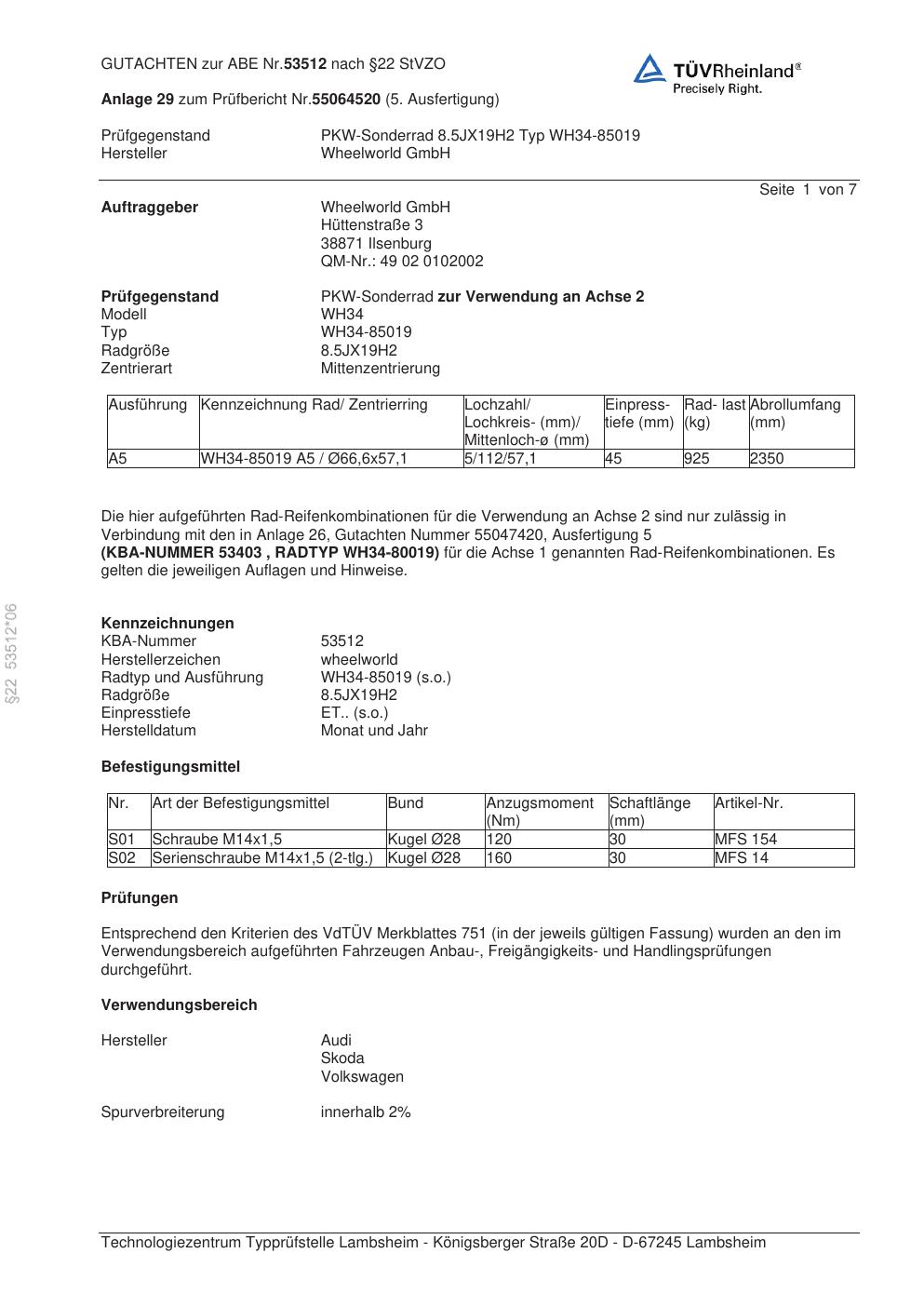 Dieses Gutachten (abe) bezieht sich auf die Alufelge Wheelworld GmbH WH34-85019 in der Ausführung ET 0, Mittenloch 0 mm (KBA 53512). Im PDF findest du typischerweise zulässige Reifengrößen, Auflagen/Anbauhinweise und – je nach Dokument – Hinweise zur Eintragung.