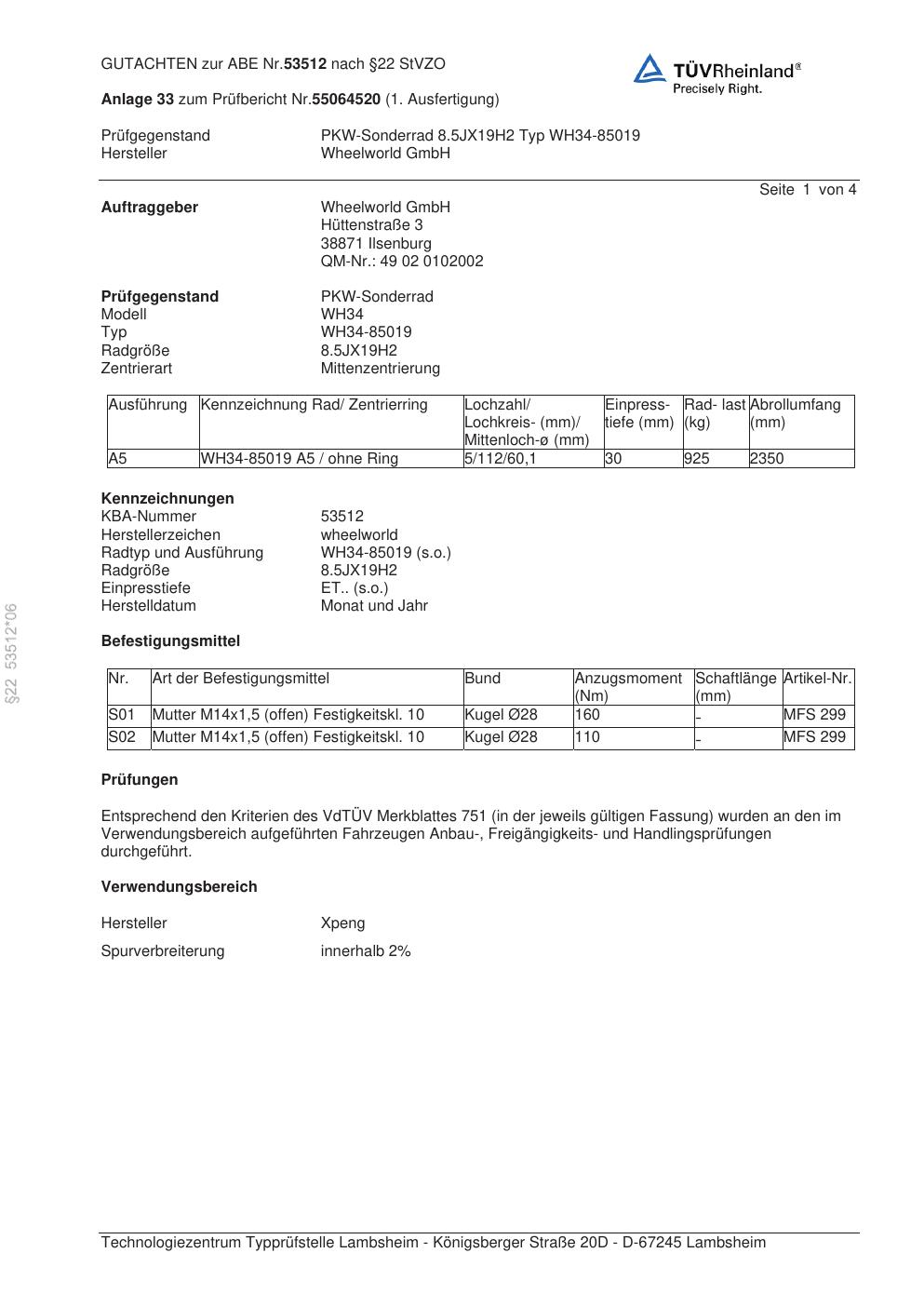 Dieses Gutachten (abe) bezieht sich auf die Alufelge Wheelworld GmbH WH34-85019 in der Ausführung ET 0, Mittenloch 0 mm (KBA 53512). Im PDF findest du typischerweise zulässige Reifengrößen, Auflagen/Anbauhinweise und – je nach Dokument – Hinweise zur Eintragung.