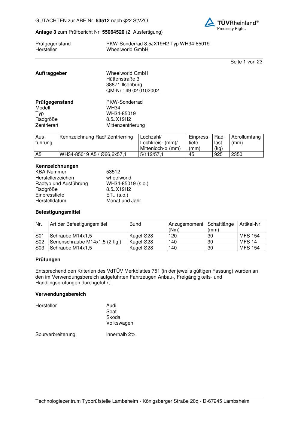 Dieses Gutachten (abe) bezieht sich auf die Alufelge Wheelworld GmbH WH34-85019 in der Ausführung ET 0, Mittenloch 0 mm (KBA 53512). Im PDF findest du typischerweise zulässige Reifengrößen, Auflagen/Anbauhinweise und – je nach Dokument – Hinweise zur Eintragung.