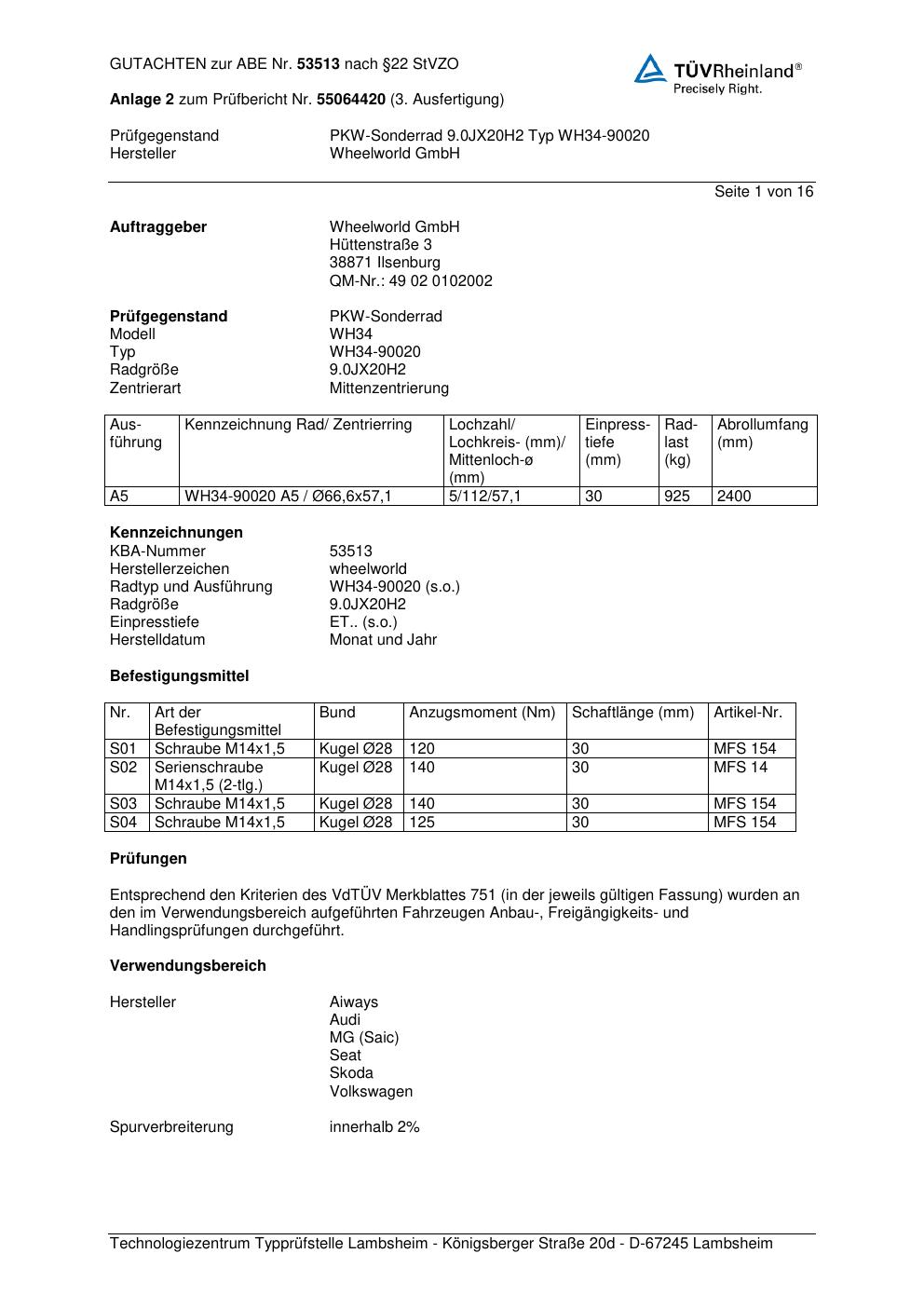 Dieses Gutachten (abe) bezieht sich auf die Alufelge Wheelworld WH34-90020 in der Ausführung ET 0, Mittenloch 0 mm (KBA 53513). Im PDF findest du typischerweise zulässige Reifengrößen, Auflagen/Anbauhinweise und – je nach Dokument – Hinweise zur Eintragung.