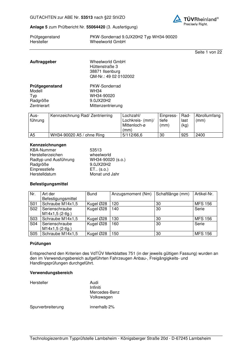 Felgengutachten / abe für Alufelgen Wheelworld WH34-900 20 (ET 0, Mittenloch 0 mm) mit KBA 53513 (Zertifikatsnummer 53513). Hier kostenlos als PDF herunterladen. Der Download-Link ist 24 Stunden gültig und kann bis zu zwei Mal verwendet werden.