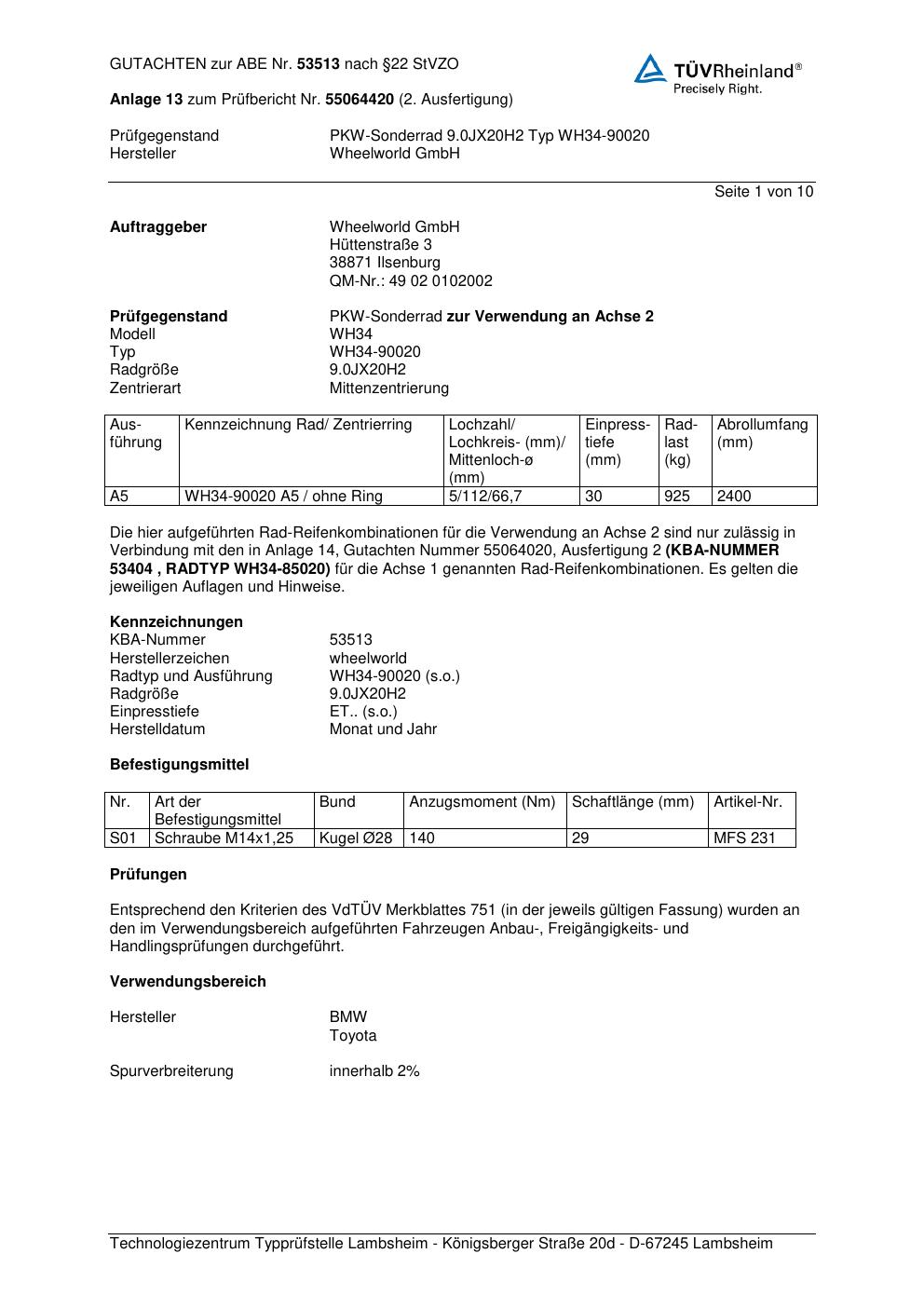 Dieses Gutachten (abe) bezieht sich auf die Alufelge Wheelworld WH34-90020 in der Ausführung ET 0, Mittenloch 0 mm (KBA 53513). Im PDF findest du typischerweise zulässige Reifengrößen, Auflagen/Anbauhinweise und – je nach Dokument – Hinweise zur Eintragung.