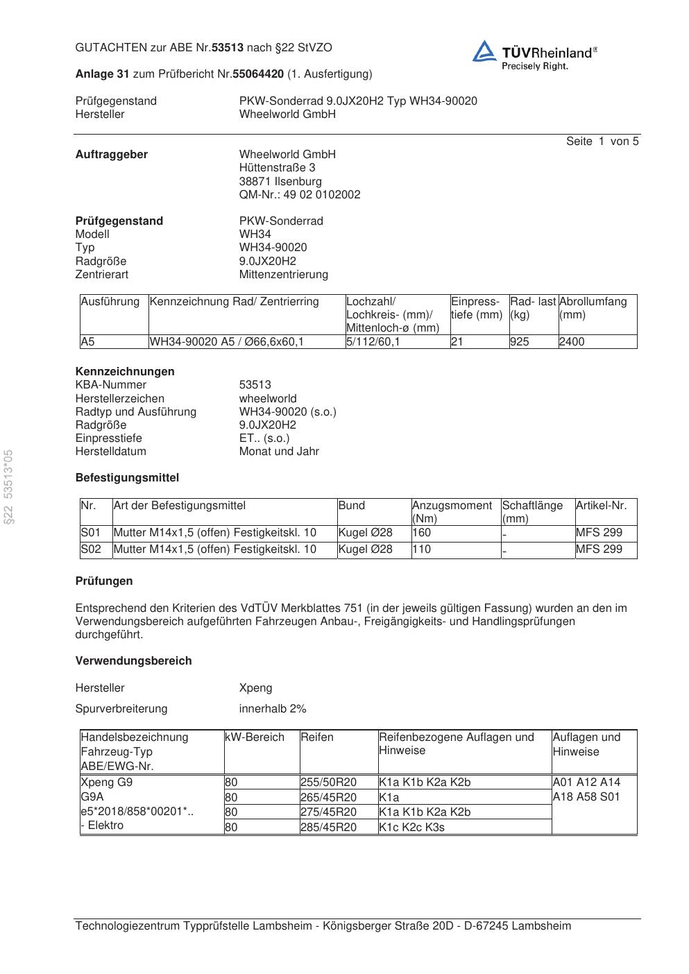 Dieses Gutachten (abe) bezieht sich auf die Alufelge Wheelworld WH34-90020 in der Ausführung ET 0, Mittenloch 0 mm (KBA 53513). Im PDF findest du typischerweise zulässige Reifengrößen, Auflagen/Anbauhinweise und – je nach Dokument – Hinweise zur Eintragung.