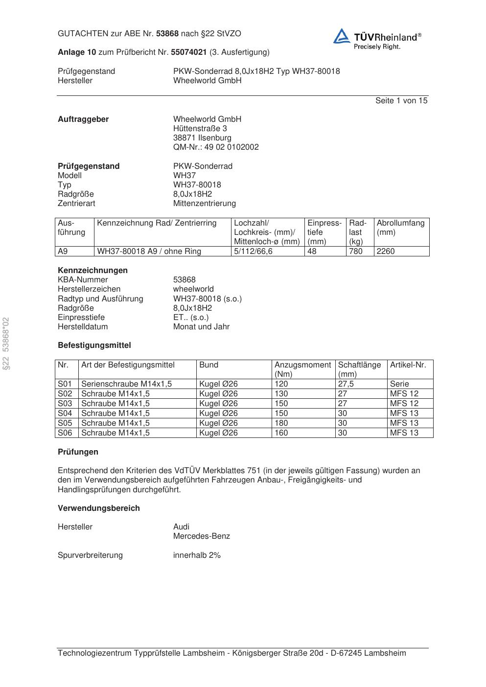 Dieses Gutachten (abe) bezieht sich auf die Alufelge Wheelworld WH37-80018 in der Ausführung ET 0, Mittenloch 0 mm (KBA 53868). Im PDF findest du typischerweise zulässige Reifengrößen, Auflagen/Anbauhinweise und – je nach Dokument – Hinweise zur Eintragung.