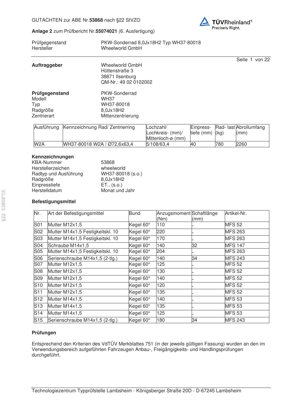 Dieses Gutachten (abe) bezieht sich auf die Alufelge Wheelworld WH37-80018 in der Ausführung ET 0, Mittenloch 0 mm (KBA 53868). Im PDF findest du typischerweise zulässige Reifengrößen, Auflagen/Anbauhinweise und – je nach Dokument – Hinweise zur Eintragung.