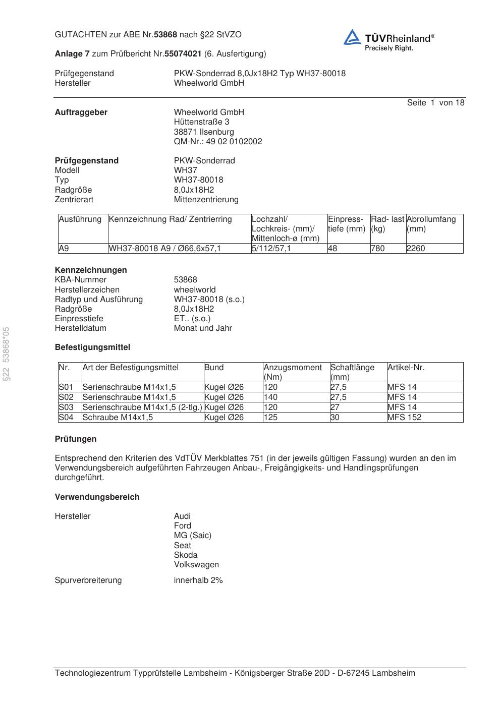 Dieses Gutachten (abe) bezieht sich auf die Alufelge Wheelworld WH37-80018 in der Ausführung ET 0, Mittenloch 0 mm (KBA 53868). Im PDF findest du typischerweise zulässige Reifengrößen, Auflagen/Anbauhinweise und – je nach Dokument – Hinweise zur Eintragung.