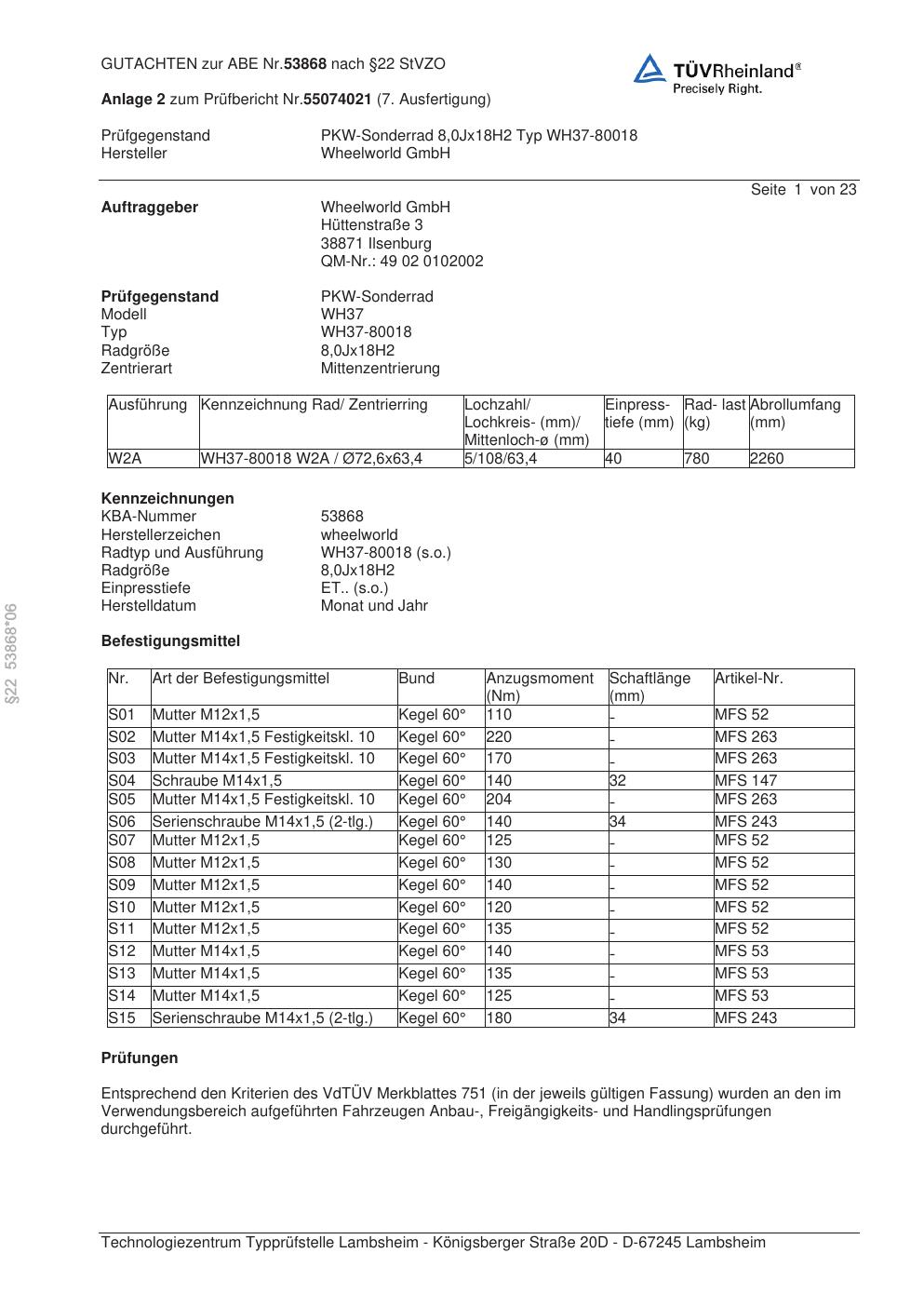 Dieses Gutachten (abe) bezieht sich auf die Alufelge Wheelworld WH37-80018 in der Ausführung ET 0, Mittenloch 0 mm (KBA 53868). Im PDF findest du typischerweise zulässige Reifengrößen, Auflagen/Anbauhinweise und – je nach Dokument – Hinweise zur Eintragung.