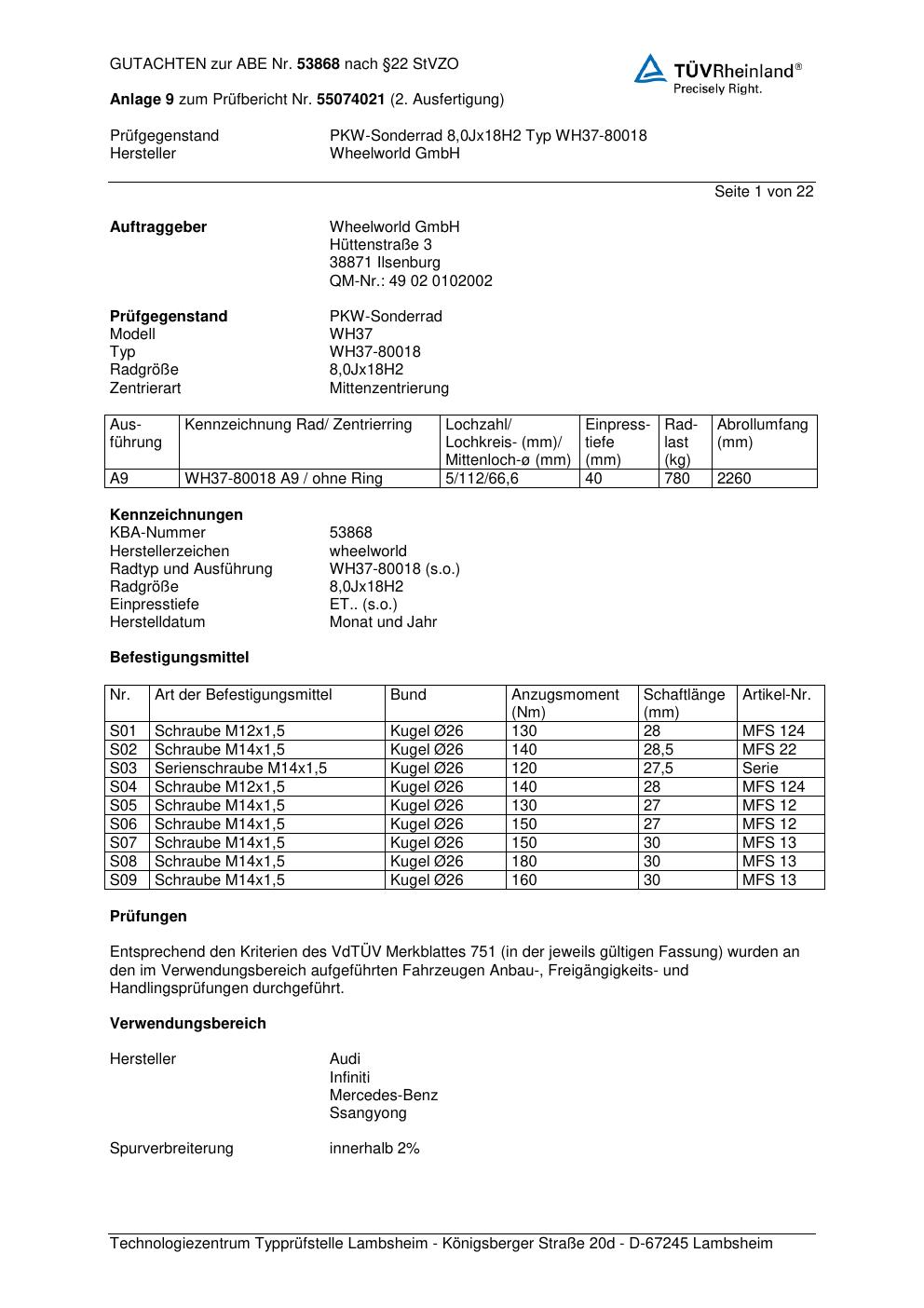 Dieses Gutachten (abe) bezieht sich auf die Alufelge Wheelworld WH37-800 18 in der Ausführung ET 0, Mittenloch 0 mm (KBA 53868). Im PDF findest du typischerweise zulässige Reifengrößen, Auflagen/Anbauhinweise und – je nach Dokument – Hinweise zur Eintragung.