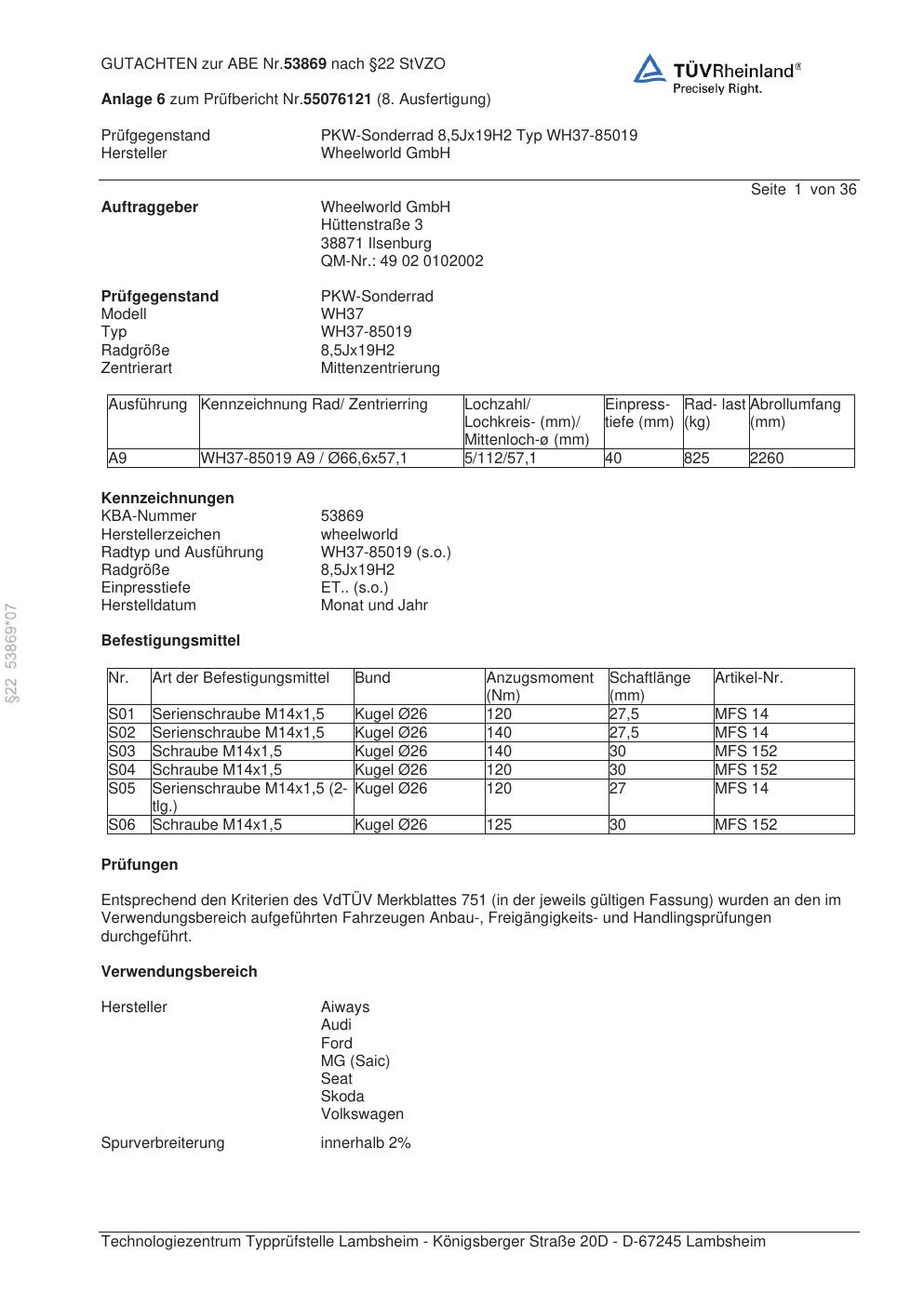 Dieses Gutachten (abe) bezieht sich auf die Alufelge Wheelworld WH37-85019 in der Ausführung ET 0, Mittenloch 0 mm (KBA 53869). Im PDF findest du typischerweise zulässige Reifengrößen, Auflagen/Anbauhinweise und – je nach Dokument – Hinweise zur Eintragung.