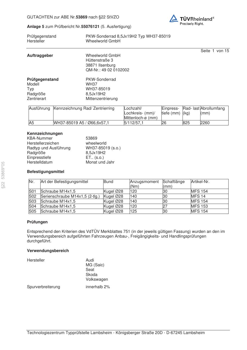 Dieses Gutachten (abe) bezieht sich auf die Alufelge Wheelworld WH37-85019 in der Ausführung ET 0, Mittenloch 0 mm (KBA 53869). Im PDF findest du typischerweise zulässige Reifengrößen, Auflagen/Anbauhinweise und – je nach Dokument – Hinweise zur Eintragung.