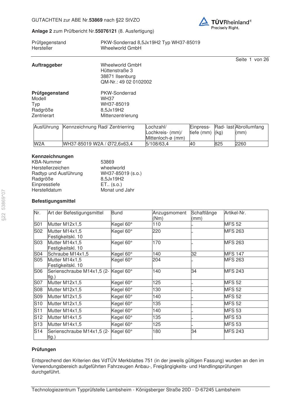 Dieses Gutachten (abe) bezieht sich auf die Alufelge Wheelworld WH37-85019 in der Ausführung ET 0, Mittenloch 0 mm (KBA 53869). Im PDF findest du typischerweise zulässige Reifengrößen, Auflagen/Anbauhinweise und – je nach Dokument – Hinweise zur Eintragung.