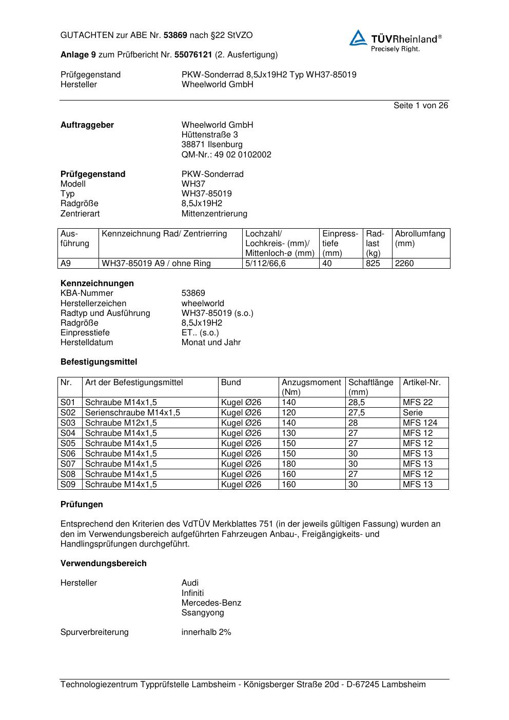 Dieses Gutachten (abe) bezieht sich auf die Alufelge Wheelworld WH37-85019 in der Ausführung ET 0, Mittenloch 0 mm (KBA 53869). Im PDF findest du typischerweise zulässige Reifengrößen, Auflagen/Anbauhinweise und – je nach Dokument – Hinweise zur Eintragung.