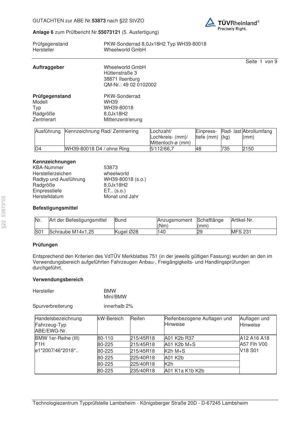 • Stimmt die KBA-Nummer auf der Felge mit diesem Dokument überein?