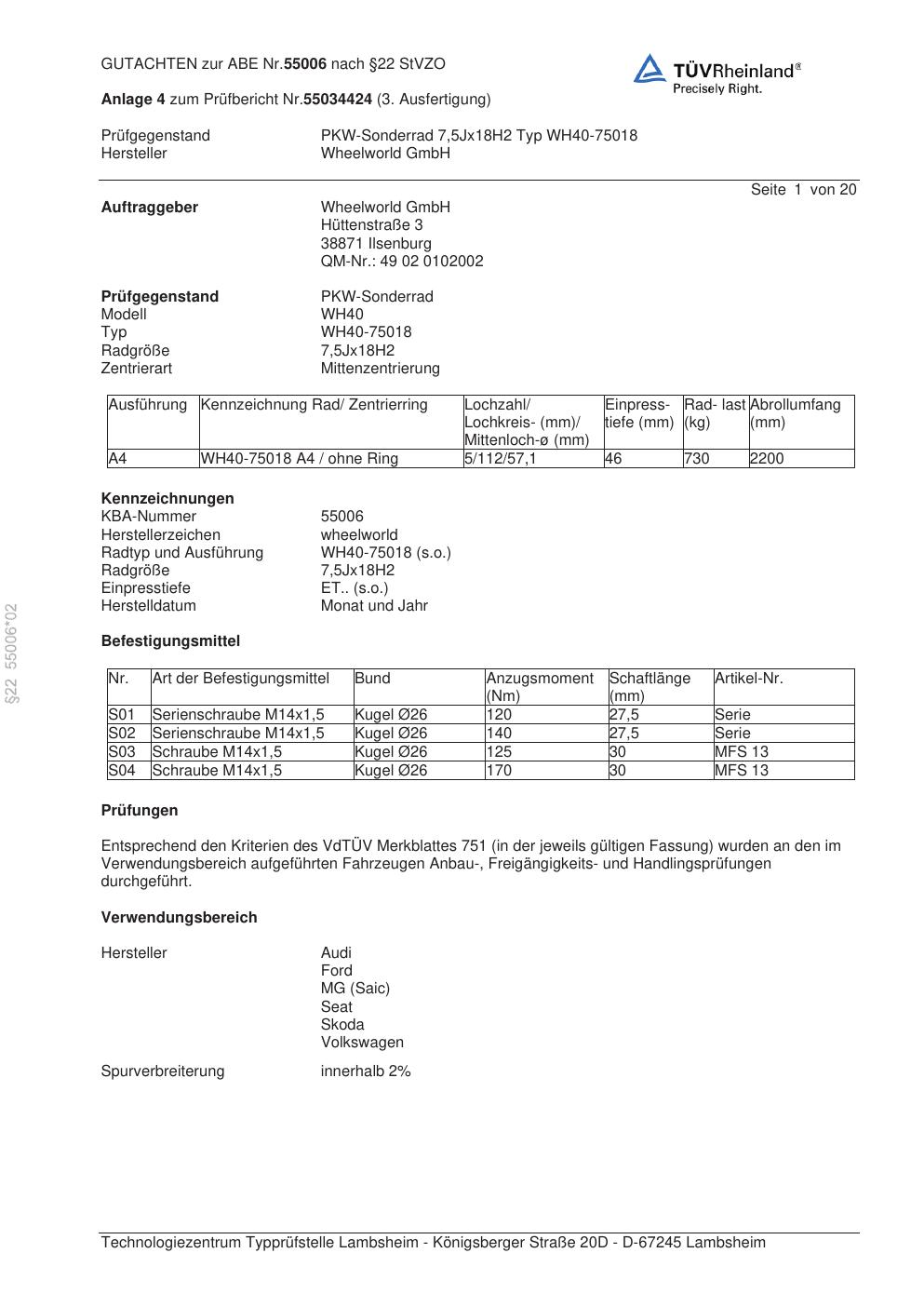 Dieses Gutachten (abe) bezieht sich auf die Alufelge Wheelworld GmbH WH40-75018 in der Ausführung ET 0, Mittenloch 0 mm (KBA 55006). Im PDF findest du typischerweise zulässige Reifengrößen, Auflagen/Anbauhinweise und – je nach Dokument – Hinweise zur Eintragung.