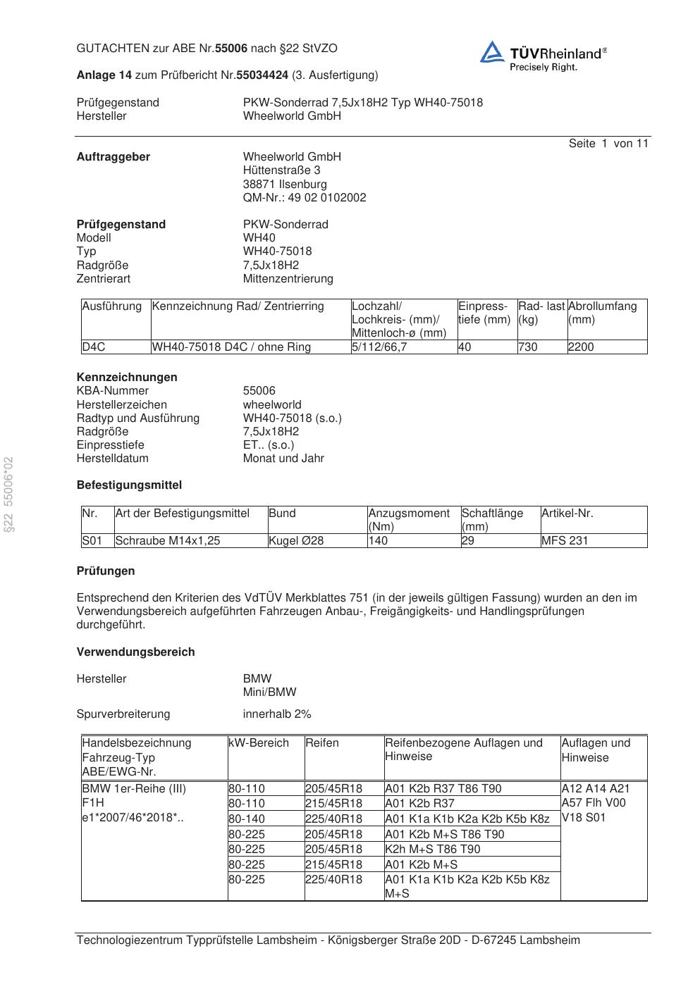 Dieses Gutachten (abe) bezieht sich auf die Alufelge Wheelworld GmbH WH40-75018 in der Ausführung ET 0, Mittenloch 0 mm (KBA 55006). Im PDF findest du typischerweise zulässige Reifengrößen, Auflagen/Anbauhinweise und – je nach Dokument – Hinweise zur Eintragung.