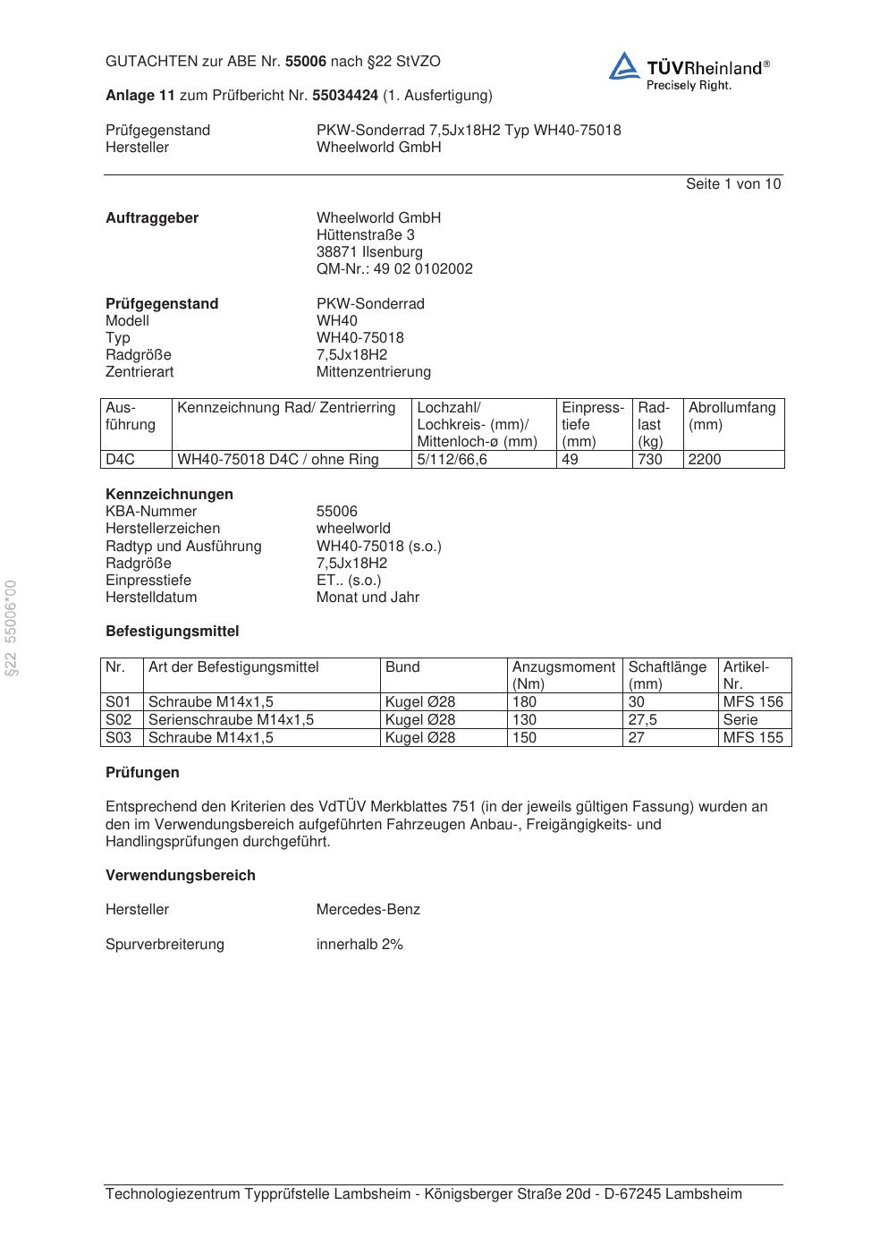 Dieses Gutachten (abe) bezieht sich auf die Alufelge Wheelworld GmbH WH40-75018 in der Ausführung ET 0, Mittenloch 0 mm (KBA 55006). Im PDF findest du typischerweise zulässige Reifengrößen, Auflagen/Anbauhinweise und – je nach Dokument – Hinweise zur Eintragung.