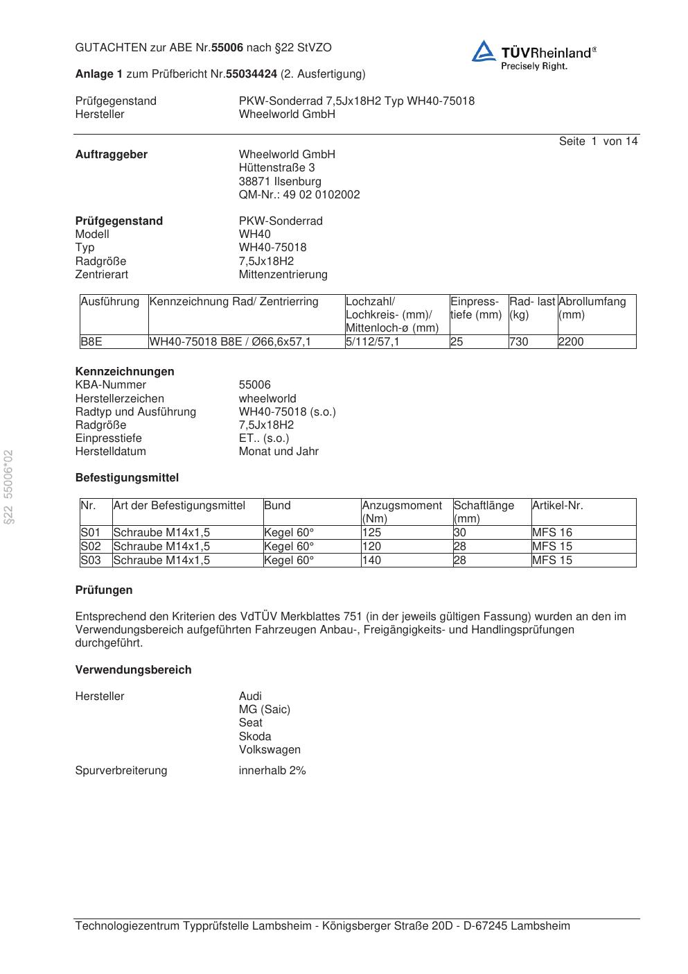 Dieses Gutachten (abe) bezieht sich auf die Alufelge Wheelworld GmbH WH40-75018 in der Ausführung ET 0, Mittenloch 0 mm (KBA 55006). Im PDF findest du typischerweise zulässige Reifengrößen, Auflagen/Anbauhinweise und – je nach Dokument – Hinweise zur Eintragung.