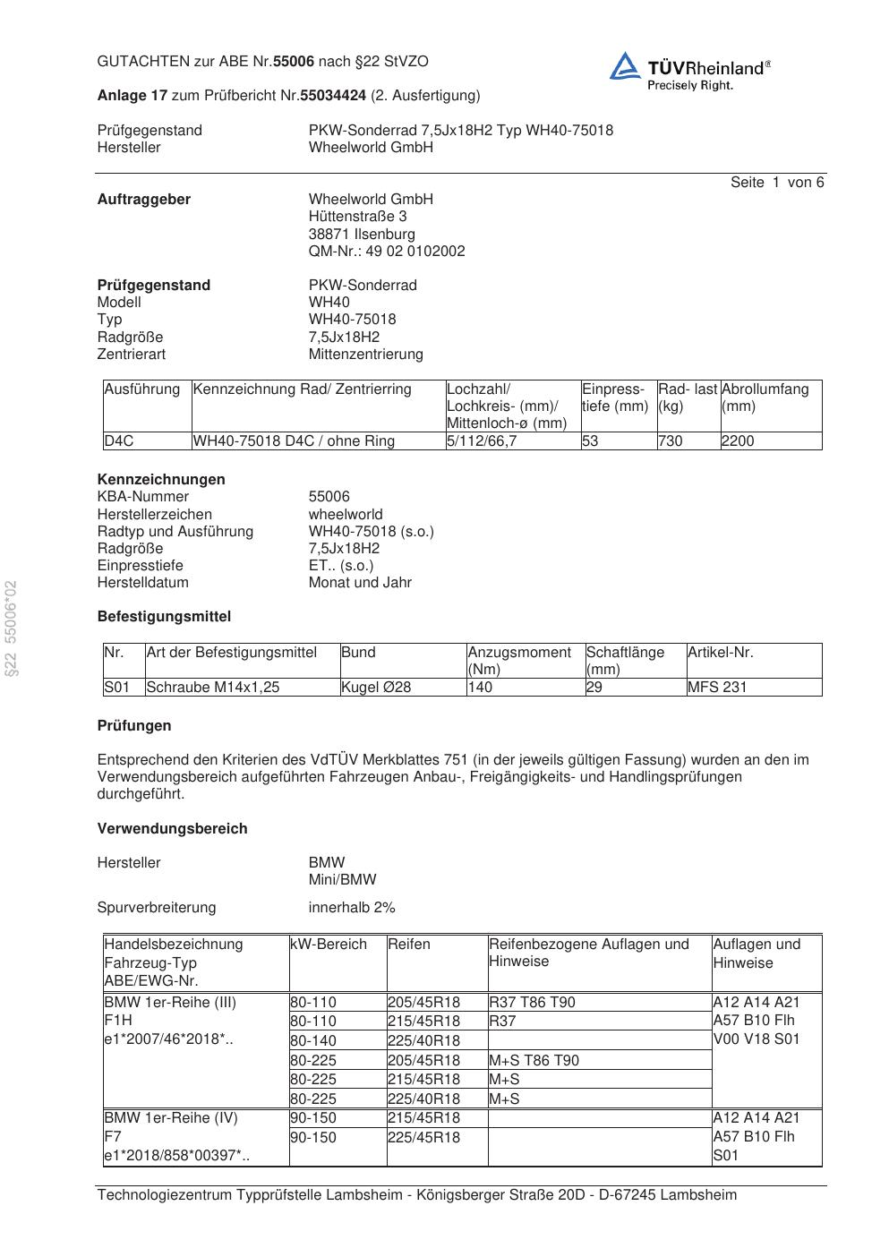 Dieses Gutachten (abe) bezieht sich auf die Alufelge Wheelworld GmbH WH40-75018 in der Ausführung ET 0, Mittenloch 0 mm (KBA 55006). Im PDF findest du typischerweise zulässige Reifengrößen, Auflagen/Anbauhinweise und – je nach Dokument – Hinweise zur Eintragung.